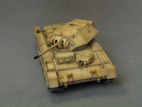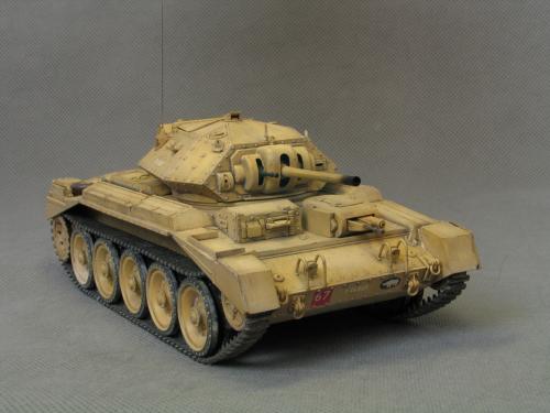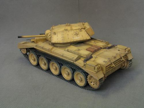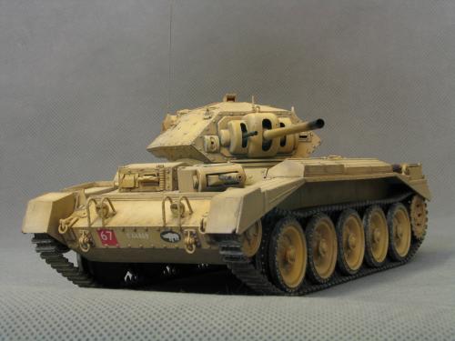 英国曾一度将坦克分为步兵坦克和巡洋坦克。步兵坦克装甲较厚,机动性能较差,用于伴随步兵作战。巡洋坦克装甲较薄,机动性能较强,用于机动作战。“十字军”CRUSADER巡洋坦克,战斗全重19.03吨,车长5.97米,车宽2.77米,车高2.44米,装备40mm2棒MK1火炮一门,备弹130发,7.92mm Besa辅助机枪2挺备弹4700发,采用了克里斯蒂式行动装置,共生产5300余辆。 最近一直在做英军的东西,感觉这个“十字军”巡洋坦克很有特色,多炮塔主义~~~~就选了这个参加比赛了。 意大利的模具,组合度一般,制作起来感觉还行。制作过程中遇到的最大问题是,履带太硬太硬,由于“十字军”行走装置没有托代轮,要做成履带的下垂感有点麻烦,用了较多的泰勒快干胶才搞定。由于是在沙漠地区作战,只做了一点掉漆。