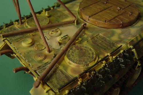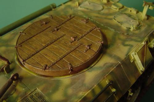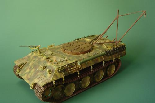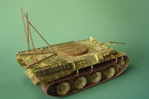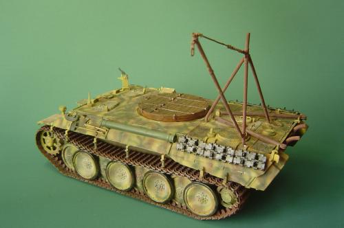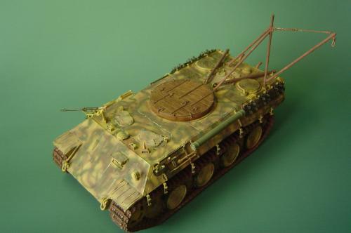 本次制作使用的是 威龙6160 豹式D型 ICM 35341 豹式坦克抢修车初期型 沃雅 1/35 德豹式坦克D/A型防爆网 两盒模型凑成的一辆中期型豹式D维修坦克 此种维修坦克在库尔斯克会战后到1944年初期在德军中使用,后来逐步被豹A底盘的抢修坦克替代. 在制作中的主要难点是上主舱盖木色的处理和资料的查找,根据现存资料,选择了早期型和中期型交接,还没有改装前舱盖的版本,木色使用田宫皮肤色打底,用油画棕色渍洗和干扫,模仿木制表面;用KMY的1mm铁环替代了吊钩,用沃雅改件加装防爆网,使用田宫漆喷迷彩并用MIG土做粉处理,感觉本次喷迷彩过淡且密度大了一些,在以后的作品中需做进一步的调整.