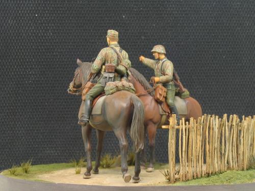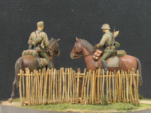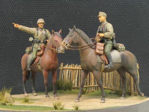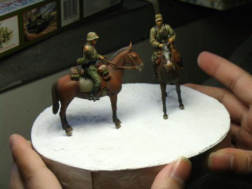 威龙1:35 6046,兄弟目前还没培养出什么德国情节,所以大幅度改造就算了。 主要就是用奶粉罐上的铝皮做了缰绳,用铜丝弯成一些钩子和铜环。 这次没去花园里扒干土,用石膏浇了地台,草坪是锯了点木屑,刷上白胶撒上去的,草丛是找了支破排笔,剪了些毛玩了一把插秧。 马匹适当做了些混色,反正就这样了,继续平民化。
