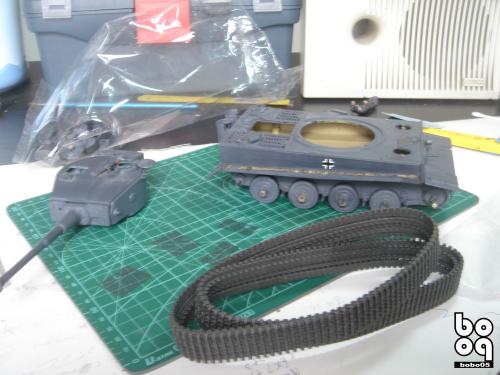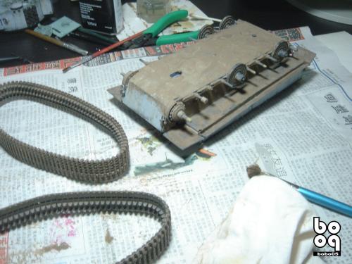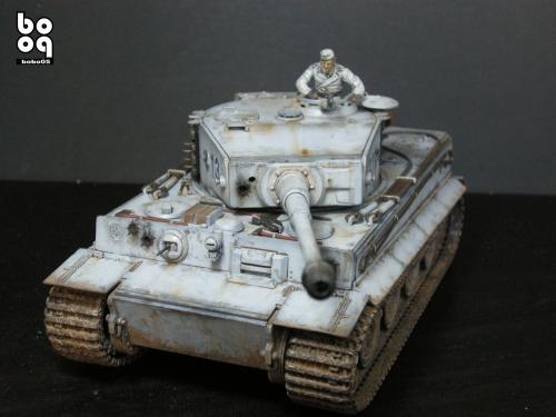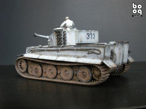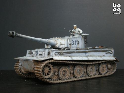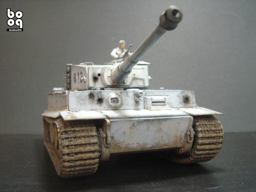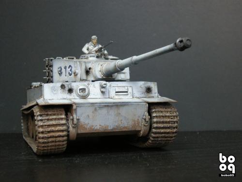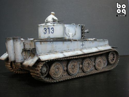 爱德美板件,编号是TA961,不同于现在的编号,不知道是不是绝版了。我是2005年购入的,当时也不太懂板件,甚至不知道爱德美这个品牌,只是在店里老板的热情推荐下,就连同几罐模型漆买下了。当时我才刚刚开始学着为我的模型上色,(其实从88年起,就开始玩模型了,一直在素组)。做一件虎式坦克却是我多年的梦想,已经无法抑制心中的激动。搬回家就开工了,因为水平有限,直做,手涂德灰,未做旧化,3天后完成了。三年来他就一直静静地躺在我的展示柜里,默默地无声无息。看了土居雅博的模型制作视频,他的一句话启发了我。“不仅仅是把模型组装起来,而是要让他来述说一段故事。”于是我开始重新为我的虎式涂装。 先是把零件一个个拆下,好在胶水涂得不多,不过轮子还是着实让我费了不少力气,有的还被弄断了轴。原来的水贴号码是蓝色的,用马克笔直接涂成黑色。 以前看过一些关于盐分掉漆的贴子,就试着玩儿了一把,撒盐水,喷消光白,水洗。结果做得过了头,没办法就又喷了一遍消光白。这下却有了漆面脱落后,反复修补的效果。为了营造气氛还在正面,用烧红的螺丝刀戳了几个弹痕。 自认为还不错,就开始做旧化。用打火机油和油画色,做渗线和流锈。干的水粉笔蘸油画色在表面蘸出较浅的锈渍和污渍。 干扫喷完抢金属的履带后,用自家院子里的土,混上褐色,土黄,赭石等水粉色,用水调开上在轮子,履带和车底上。用粉彩刻画排气管,炮管和弹痕熏黑的效果。 最后,在履带,机枪等处干扫上鉻银色,完成雪虎的最后组装。 兵人是板件自带的,原来是黑色的制服,参考田宫的封绘涂成白色。 制作中尝试了多种以前没用过的技法,有的是自己琢磨的,在尝试中体验了做模型的快感,真是过瘾。