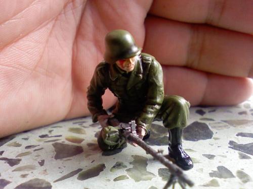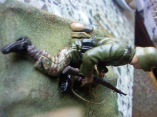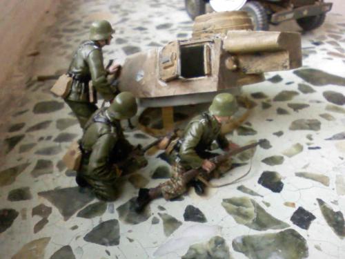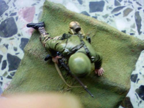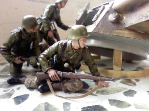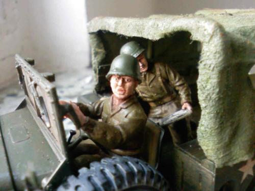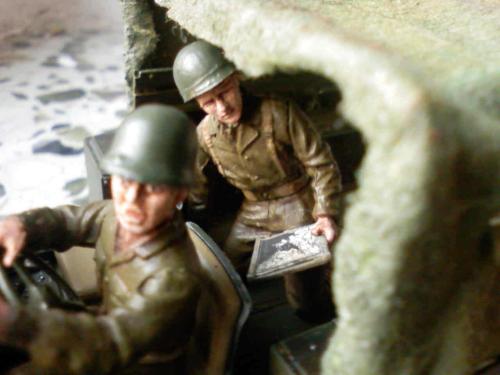 德国伏击人员使用龙的一代兵套件,美军驾驶员为意大利威利斯驾驶员加龙的手臂与头盔改的,搭乘人员是威龙美军空降兵反坦克套件里的,不存在盗版问题。场景工程较大,单以兵人参赛~美军兵人及卡车全部丙烯手涂,德军为丙烯+仙盈水性漆手涂,枪带是华泰粘胶的外皮裁的,整体成本较低,未作较大改动