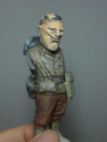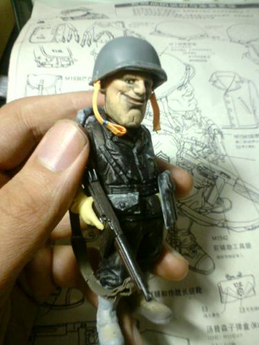 盔带和枪带均使用橡胶带完成,扣环用铜线改造,难点是美军汤姆森冲锋枪的背带非常穿法特殊而复杂,盔带改造到位可以真正的扣上 考证是诺曼底登陆的美游骑兵部队,头盔是上尉军衔,左臂手绘游骑兵臂章,裤子涂装是1944年诺曼底登陆游骑兵部队普遍的绿色式样,没有使用封绘29步兵师的褐色