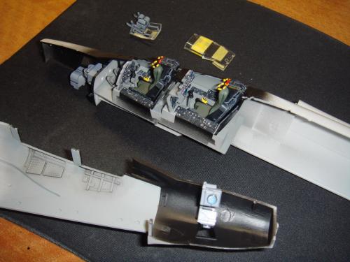 使用套材:长谷川1/48 RF-4EJ 09574 辅料:郡氏油性漆及稀释剂,田宫水性漆及稀释剂,田宫补土,胶带纸,砂纸,打磨膏等等. 细节:按说明书去除机身上不需要的突出物并打磨,用补土填缝,为增加生动感用长谷川1/48 F-14套材中飞行员的手代替原套材.不喜欢飞机脏脏的感觉只是简单的渗线和旧化. 难点:机身迷彩的制作我先用笔在机身上勾画出迷彩的线条,再用纸片依形剪出迷彩的形状用胶纸贴于机身用喷笔喷涂出来. 制作心得:这是我做模型以来做得最用心的一次,无论是喷漆,水贴以及细节.6月1日就是我儿子1周岁生日了,也算是我这个当爸爸的为他亲手做的生日礼物吧.在这里也谢谢本论坛上曾经给我提供帮助的朋友们,谢谢.最后说一句:重庆的同好加油.