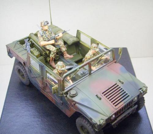 编号9?开始以为是模型编号呢,后来想想应该是战术编号,实在是找不出战术编号9的车辆,找来了爱的美的M966悍马车,就算有了一个9了,呵呵,虽然牵强,总比没有的好啊。 制作上除了打磨费了点时间,其他组合还算不错,兵人手涂,没啥技术含量,完全按照封绘涂的,手艺差,只是不想带来的兵人浪费了,另外拍照还有点生机! 没用任何补品,直做! 制作心得:就是玩儿,好玩儿! 家里相机是在对不起观众,210w像素的,拍得也不咋地,中间的车太小了,所以用ps剪切了一下,不知道怎么搞得,变得这么小了,问了朋友,才知道,相机拍照的照片就800*600,不是最高的品质,我倒~~~~~~~~没办法,参加比赛就是我最大的娱乐了,希望我的参与,没有影响比赛的顺利进行,下次比赛可得借个好点的相机~~~