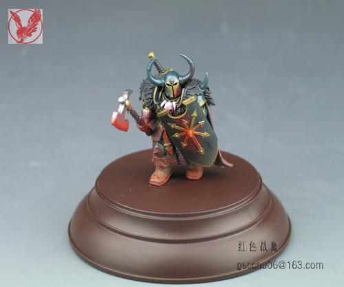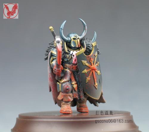 这个小兵是从玩混沌朋友手上抢来做着玩的,练练涂装技巧,有很多自己DIY的部分,纯属瞎搞。当时边做边意淫,基本思路就是自己调配邪恶的金属蓝,细细涂上各陆金色花边,朋友说基本快涂成神选了。。。另外就是意淫模拟战斗状态,先用盾牌尖刺撞击,再用膝盖顶对手腹部,最后一斧斜劈下去从颈部到腰部,鲜血渐满混沌战士一身^_^。。。 不会用ACDsee,用PS调整了一下图片大小,照片未处理 自暴下缺点:血迹颜色太红比价失真,皮毛的表现还要加强点