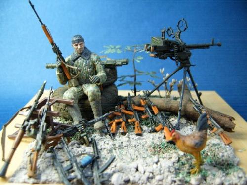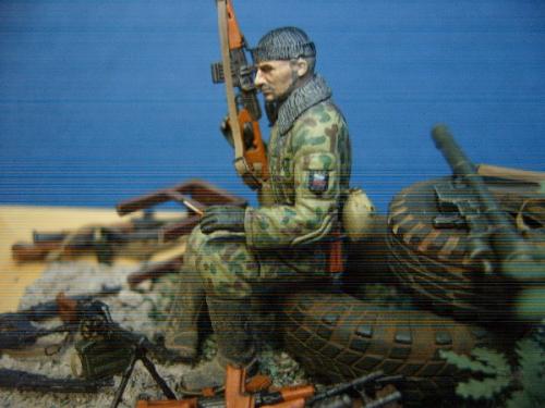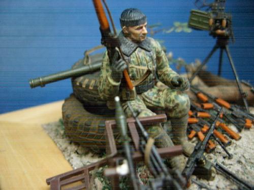 主体用了龙的3008,脑袋用了美军狙击手的,由于板件太肉,将大部分的衣服折皱重新刻线,那块翻毛领用钢锯条拉毛,原件实在不怎么样,武器都是平时四处收罗的。