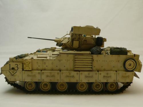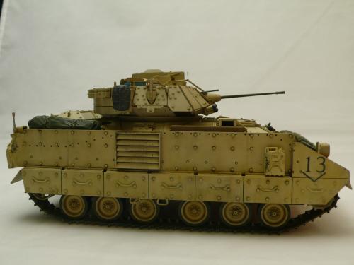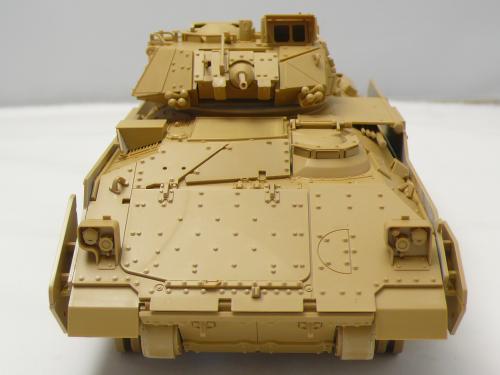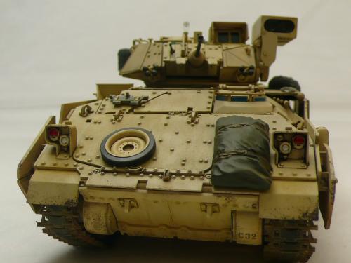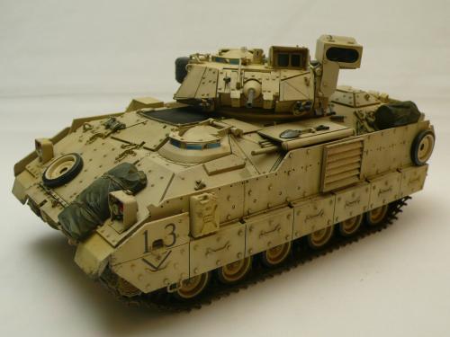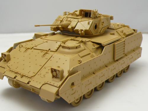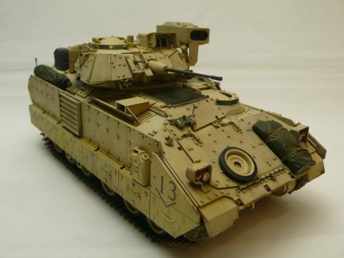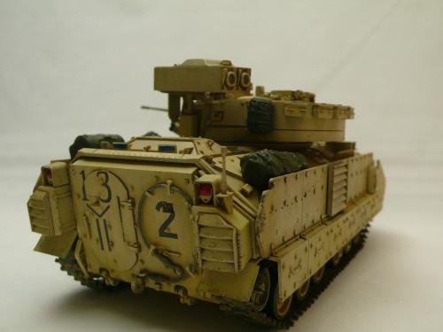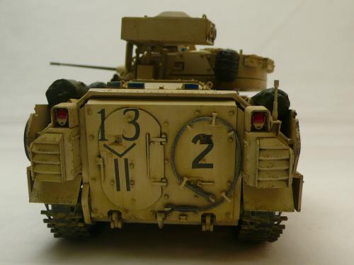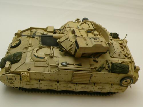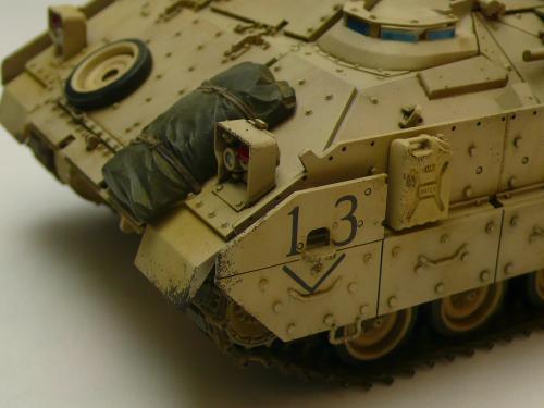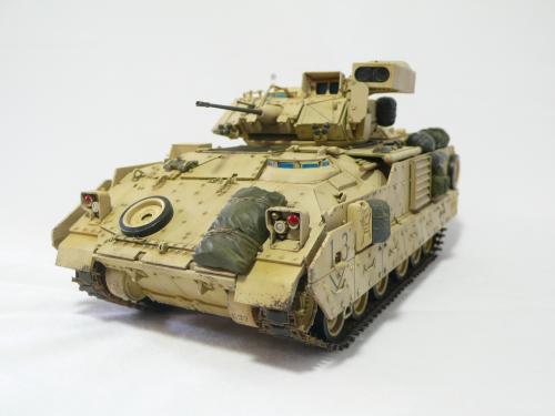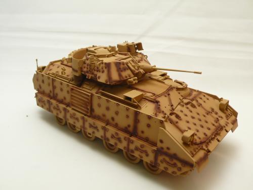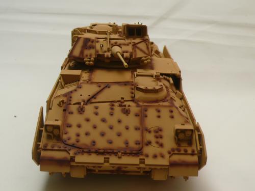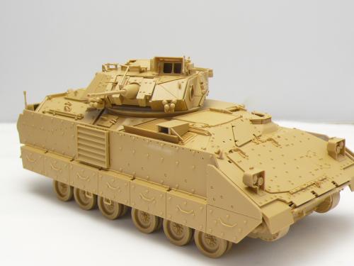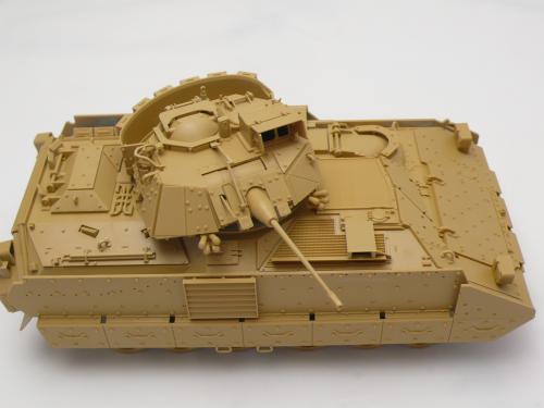 套件:田宫M2A2ODS 1:35; 补充套件:AFV大脚活动履带替换橡胶履带。 上色: 一、主色:1、XF-59打底,XF-10做阴影,原计划用XF-57做主色,喷涂后个人不太喜欢于是改用C313中东的沙漠黄。在喷涂C313前没有再喷阴影,因此阴影较淡。2、履带和大毒蛇机关炮用C28喷涂。 二、偏差色:用咖啡色对全车凹陷部分进行洗涂,突出全车线条。考虑到黄色本色已经很浅,没有进行干扫。 三、旧化:1、用白色、土黄、熟褐三色对全车斜面、侧边、前装甲、后部进行滤镜处理;2、进行局部海绵掉漆,用XF-1+XF10作为掉漆的颜色,其实呢美军车保养很好掉漆还是很少的;3、用土黄色和浅土黄色的粉彩对容易积灰、染尘的地方打粉,部分地方我还用了点白色粉彩想做出沙漠地区的褪色效果. 四、制作心得体会: 1、田的组合不错,就是开模不细,比如潜望镜整体开模,不如号手的用透明片效果好,所以我也用大小合适的薄透明片涂透明蓝(可惜没有找到实车潜望镜的酒红色)粘在潜望镜观察孔上。 2、以前没有做过沙漠涂装,这次是第一次,感觉洗涂液不能浓只能稀,否则全车会看起来过脏造成失真,觉得效果欠佳可以多洗几次。类似的滤镜的颜色也应点得少点,不然用笔涂时太浓,就有点过了,同时滤镜点色不那么均匀,可以把颜色分布拉开些。 3、原计划做点流锈,后来看了一些M2A2的图片,实车没有流锈,所以放弃。 4、难点:感觉浅色的单色车由于颜色单一,要做得好,还要在颜色运用上下功夫,通过多层次的丰富颜色让全车看起来更真,同时又不能把车做“花”。对于该车的顶部装甲旧化,我不满意,留待以后继续了。