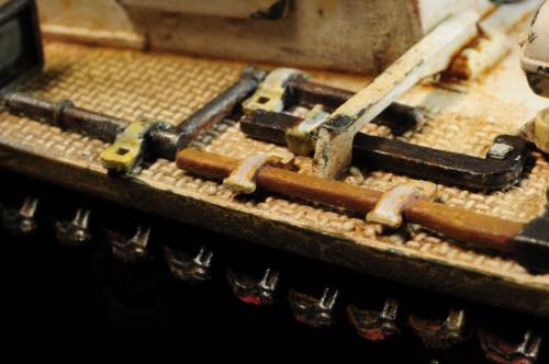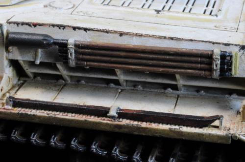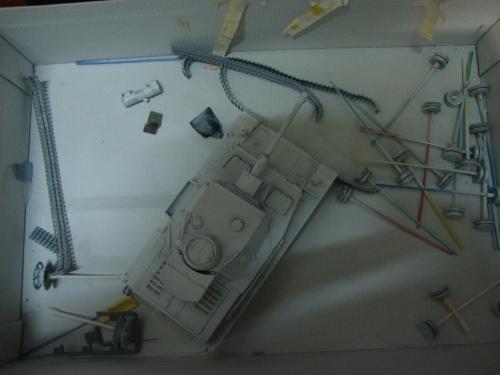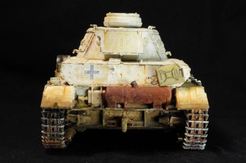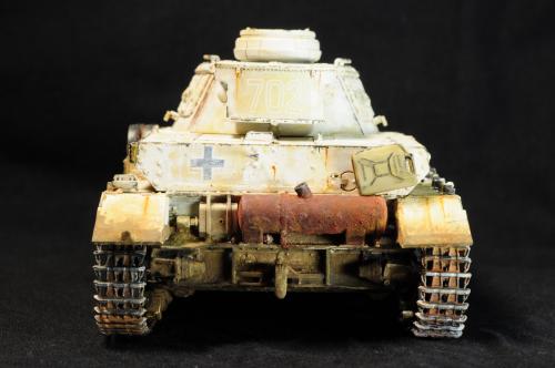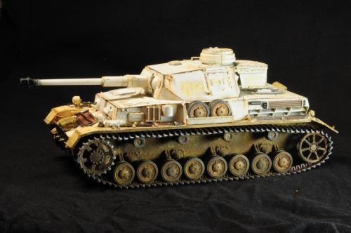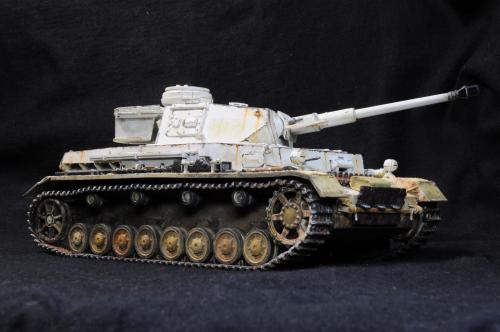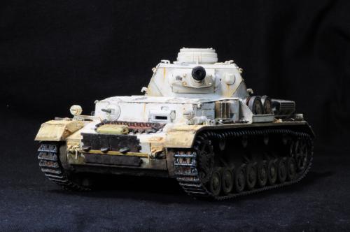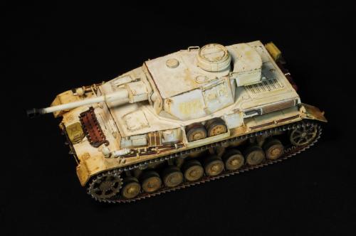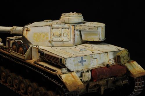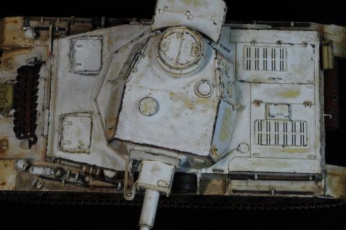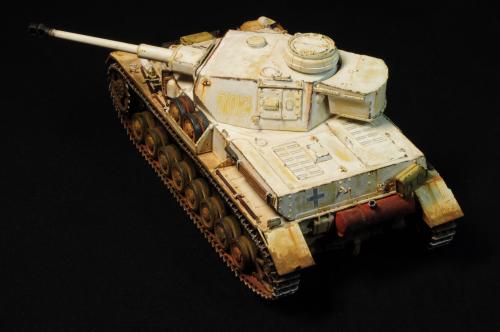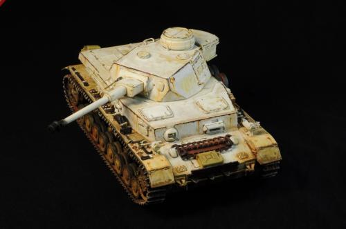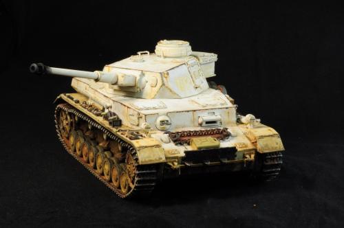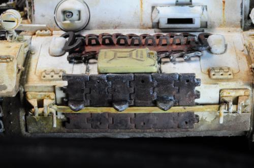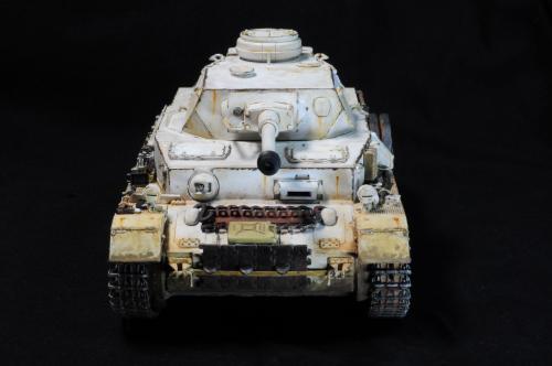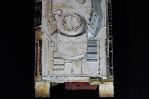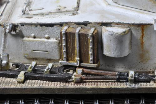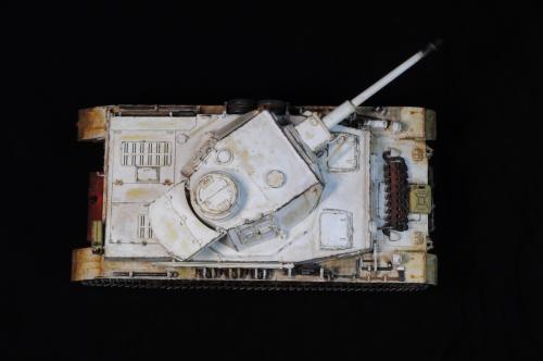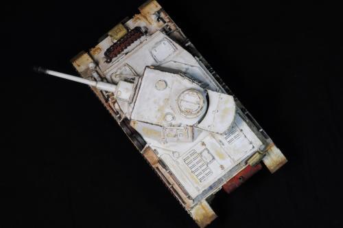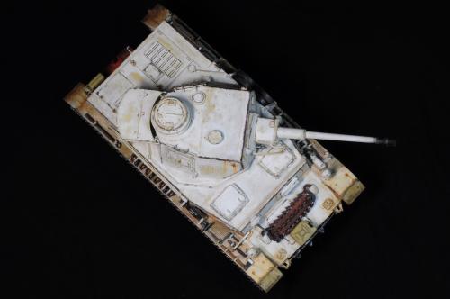 声明一下:调整软件的Ver1.00 是尼康相机的内置图像处理软件版本号,非后期处理。 本次制作使用龙的6363号套件。 车体上色旧化过程: 1、喷1000号水补土。 2、君仕21号加39号打底色。 3、用田宫水性漆白色喷涂大概80%的面积,一次喷涂容易透底,所以喷了2、3次。 4、用油画颜料、丙烯颜料、白色粉彩点涂、刷涂、喷涂做出白色斑驳感。用毛笔、棉签等蘸田宫稀释剂擦拭车体模拟掉漆。 5、喷涂结束,在凹陷处用粉彩强化阴影。 6、进行局部的渍洗。 7、用田宫德国灰色点掉漆,在掉漆的基础上用棕色粉彩润饰。 8、底盘泥土用广告色棕色混合石膏、补土、水的混合溶液糊上。随后用干粉彩润饰。 9、工具木柄上色前用针划出纹路,随后进行渍洗、干扫、粉彩润饰。工具金属部分用黑+金属灰色打底、棕色粉彩润饰、银色干扫。 10、履带黑色打底,粉彩湿洗,干粉彩润饰。银色干扫。 11、做出流锈、烟熏并用铅笔加强个别部位的金属光泽。 制作心得: 由于冬季迷彩颜色相对凌乱,所以在整车的主要棱角处夸张了掉漆效果,用深颜色的掉漆将颜色收住。 泥土的上色和车体有相通之处,都要考虑光影效果,因此在堆积泥土的凹陷部位用黑色粉彩干扫,突出光影效果。 冬季迷彩底色很浅,粉彩的颜色很容易在其上留下痕迹,因此在表现白色的部位要慎用土色粉彩,以免最后的效果显得太脏、太乱。