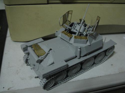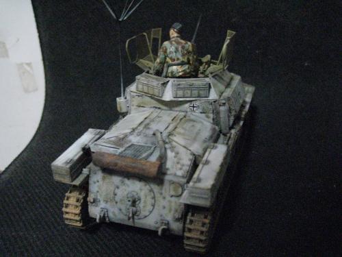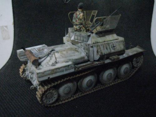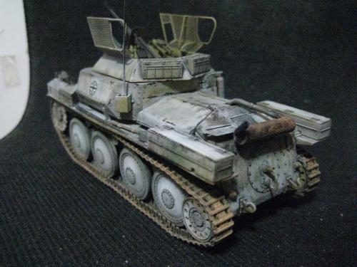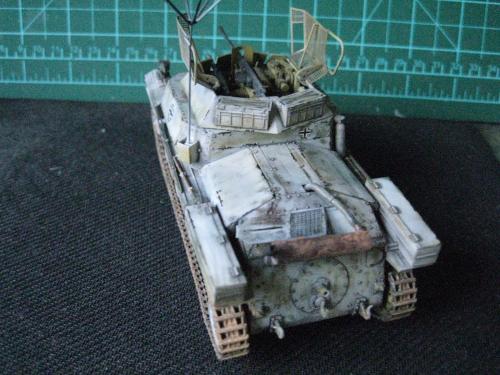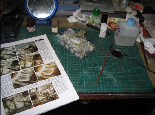 龙的6294 38T侦查型,德军利用38T底盘改装的轻型侦查车辆,广泛活动在东线。这个车型算是38T系列中比较有特的,而且套件给的辅料充足,所以只对排气管稍作修改,其他直做,在完成素组后我首先使用1000号水补土打底,在水补土干透后用盖亚的锈红做阴影,再用君士的油性德国三色套漆喷了主色。然后用田宫的水性消光白喷全车,上了一道田水光油。完全干透后用棉签蘸水性溶剂在战车边角蹭掉白色的漆层,使底色露初,在用君士旧化套漆中的铁锈和黑铁色点掉漆,最后用黑色马克笔强化。 然后用田宫的珐琅漆红棕稀释液滋洗全车,在滋洗液彻底干透后用面相笔蘸黑色和红棕混合的珐琅漆稀释液做渗线,完工后用棉签蘸取法郎溶剂顺流水方向擦洗掉多余的珐琅漆,底盘和排气管用AFV的天然土做了少许修饰,最后喷了道消光保护漆。