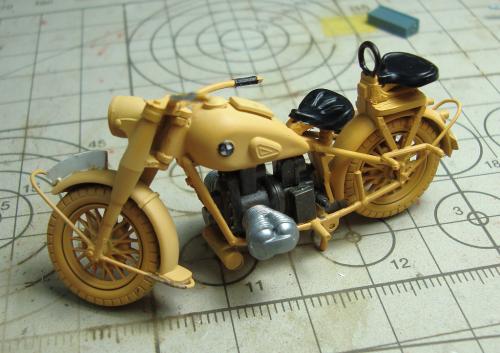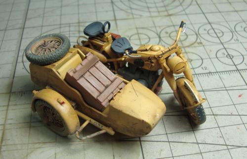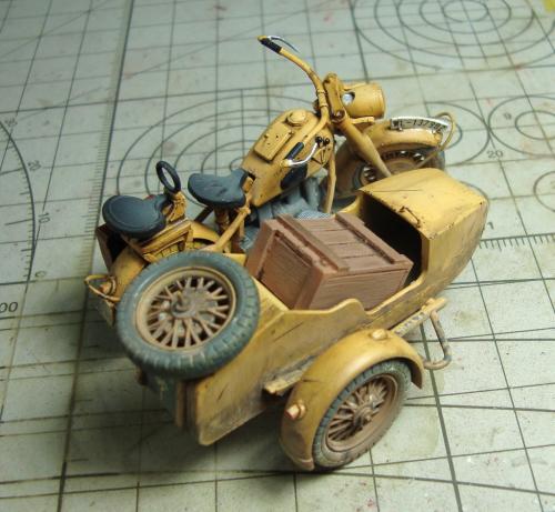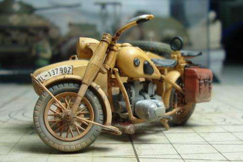 使用田宫的套件,72年的模具,相当的肉以及悲剧。用铜丝以及铜管自制了部分细节。 油箱上的BMW的标志还是涂出来效果好一些,因为笔不好,效果不是太好,如果有水贴就很赞了! 摩托的分色比较麻烦,特别是轮子的胎黑,如果能转动就比较好操作。 边上坐斗里面的细节惨不忍睹,用湿巾做了个篷好象也不是很好,或者放个弹药箱盖一下。这块(帆布?羊皮?毛毯?),你觉得象什么就是什么! 滤镜、渍洗、消光后上了MIG土做尘土。收工~!