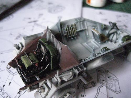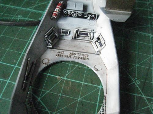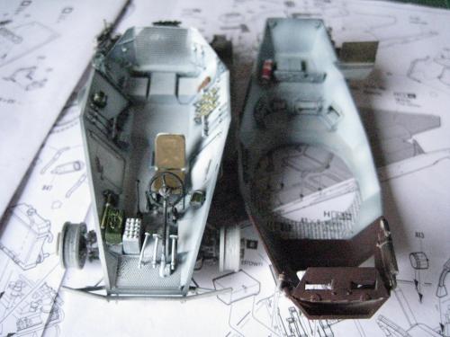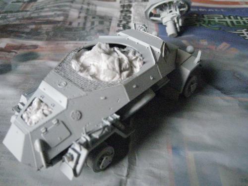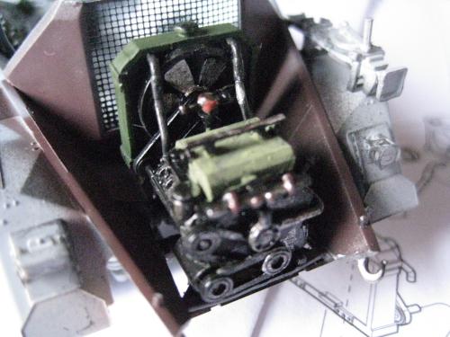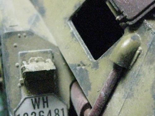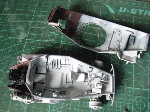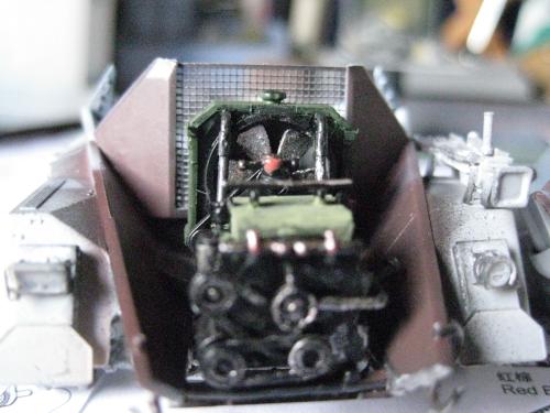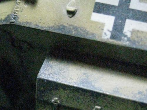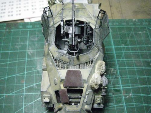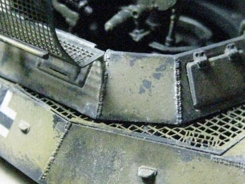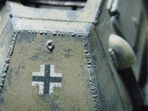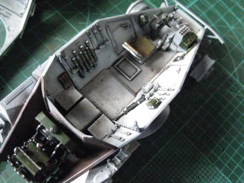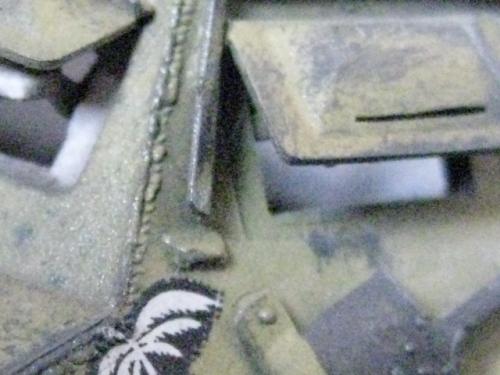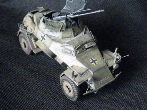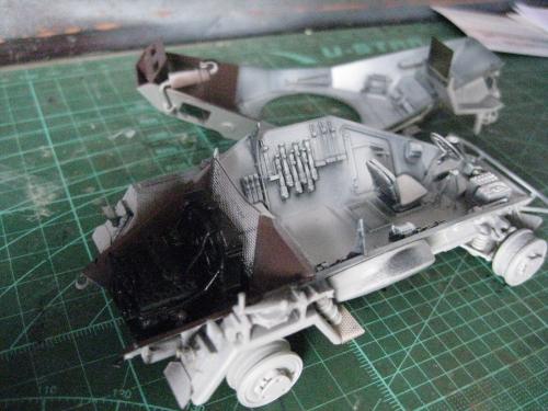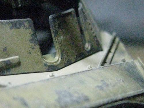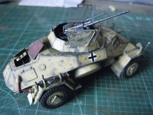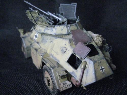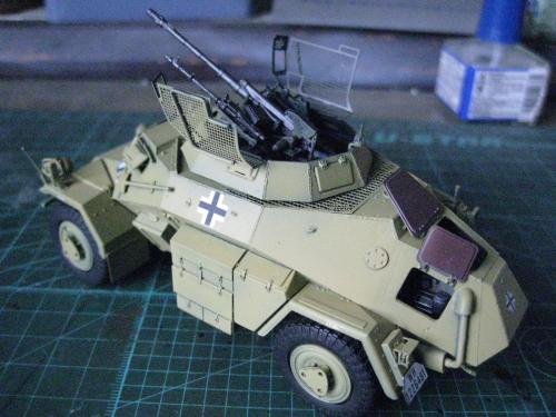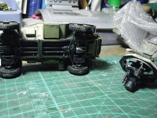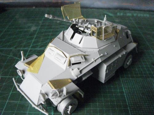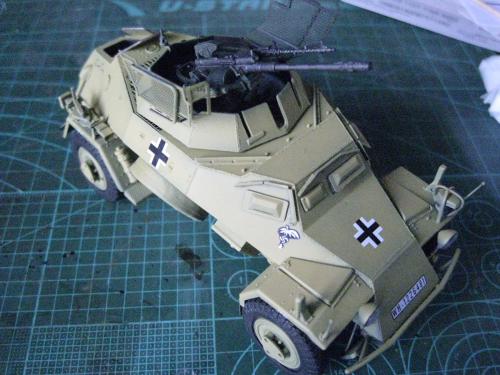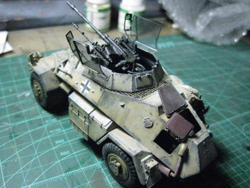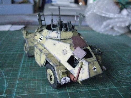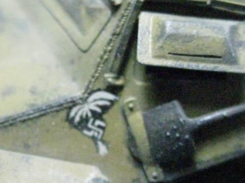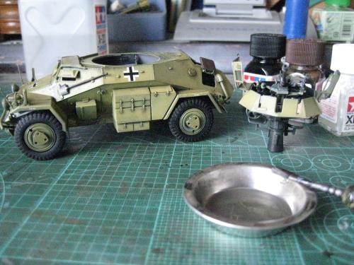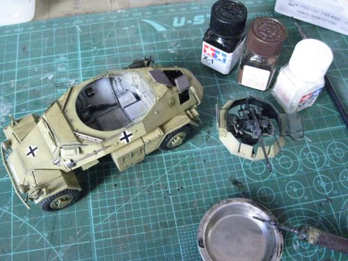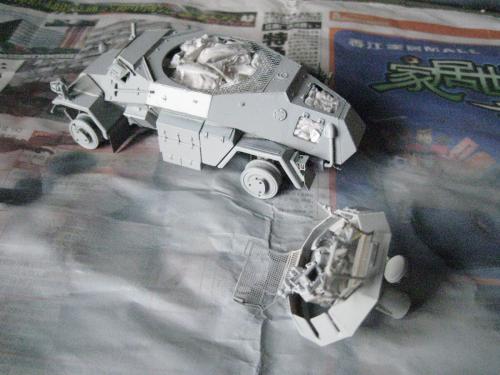 这次选用了HB的新版222,套件完胜老田的222,不但全内构,还带了3大张PE,开模虽然不够锐利,但毕竟很值得一作。 下面是制作过程: 1。素组过程进行还算顺利,主要是号手板件的老问题,合模线N多,打磨的手疼,由于是全内构,我上下车体没有粘合,主要把前车观察窗和发动机盖改成活动,便于展示内构,用手手钻把20mm炮的消炎口全部钻通。其他直做。 2。喷漆:先用君士的金属底漆喷涂PE,待金属底漆干透,内构喷1000号水补土,静置24小时后,用亚光黑全喷内构,在分别遮盖喷涂防锈红和内构白,笔涂发动机和内构部分,待漆干透上水贴,再用黑+红综色法郎漆混合液滋洗全车,漆干透后点掉漆,再用海湾色天然土轻焼,发动机部分上点少许锈红土,边角用银色干扫即可。车体用遮盖带固定后粘合。内部用报纸棉球堵住,全车用德国灰喷涂,再用沙黄喷涂全车再边角等处薄喷做出阴影效果,炮管和机枪单独喷漆。 3旧化:全车上完水贴后先全车薄喷光油,统一车体和水贴色泽,再滋洗全车,滋洗液干透后用棉签沾溶剂顺流水方向插去多余滋洗液。分别用田水泥土色,白色,浅沙黄色薄喷全车做滤镜,模仿沙漠尘埃,用海面法沾德国灰点掉漆,边角再用铅笔轻划,模仿更深层掉漆和划痕。 4收尾:用各种土色涂在轮胎上,再用沾溶剂的毛笔干扫轮胎,做出立体感,最后全车喷罩光统一色调收工。
