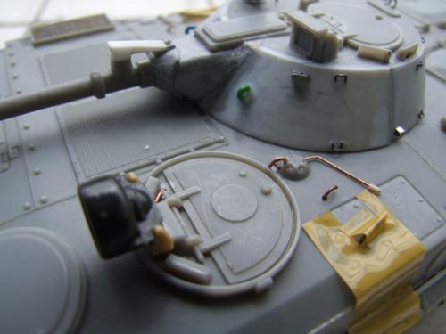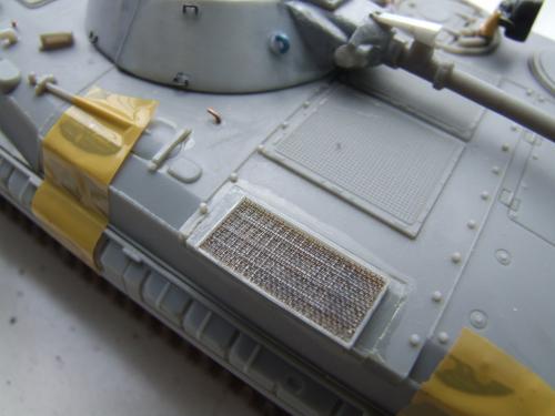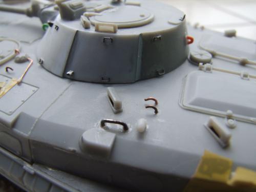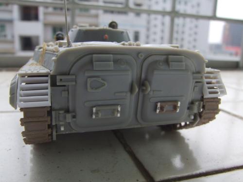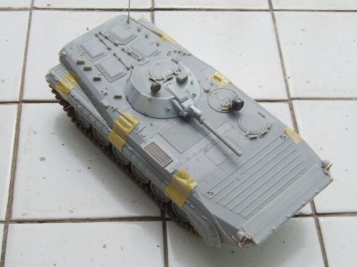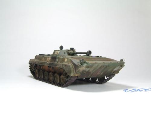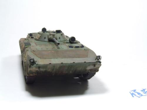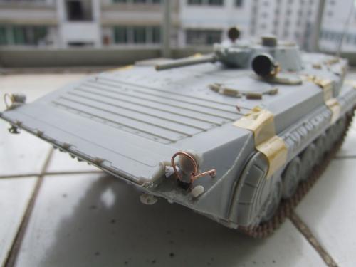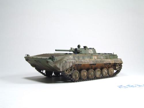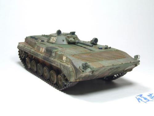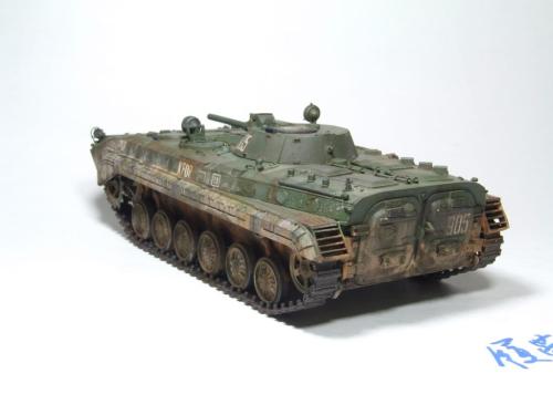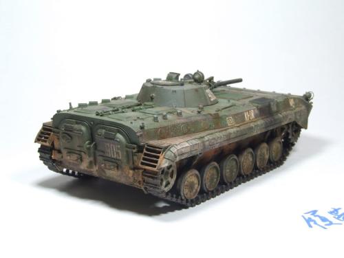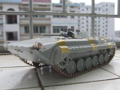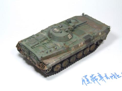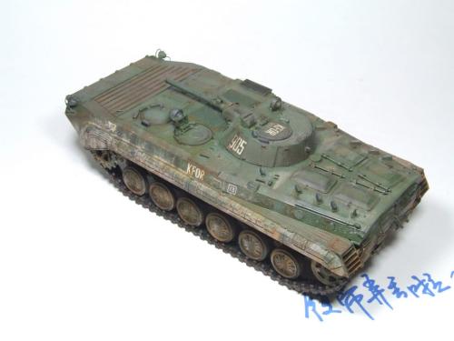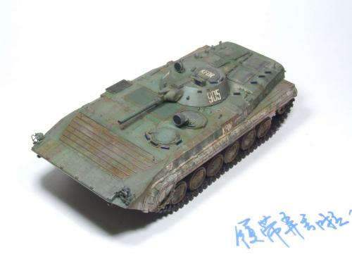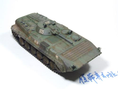套件采用龙的老苏军系列BMP-1步兵战车,自行由于开模年代久远,外形不是很准确,细节也有很多缺失。组合时自行用铜丝,金属片等添加了把手、挂钩、车灯架等一部分细节;用不同厚度的胶版做了炮塔修正。上色采用郡仕1000#水补土打底,郡仕油性漆自行调配苏军绿。细部上色用到的是丙烯颜料。旧化用深棕色将全车凹线走一片,再用爽身粉+丙烯颜料堆土,用天然土+兰盖贴纸软化剂做色差和固定。