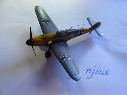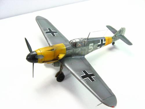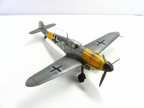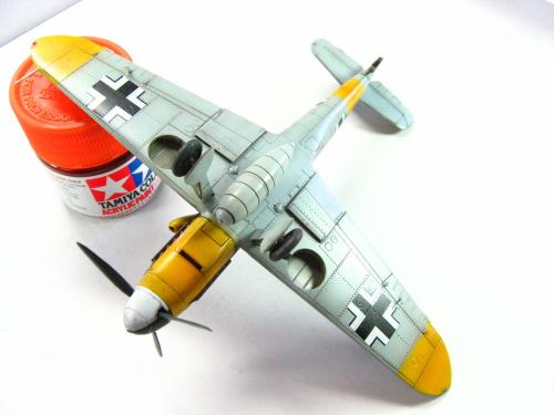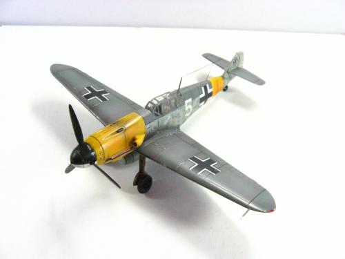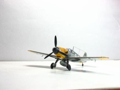 FineMolds的1:72 BF109F-4.板件是非常不错的,带有简单的发动机内构,但是要做成展示的话,要改的地方实在太多了,所以做的时候直接就合上盖板.涂装参考了AEROMASTER的方案,采用了1942年JG52联队的巴克霍恩座机,白色5号和巴的个人标记的水帖是从堆积中找出的.模型里面带的那套迷彩水帖实在是没有用武之地....做的时候也没有仔细考证,做完才发现翼尖下面应该没有黄色的:(