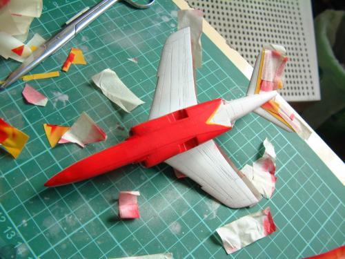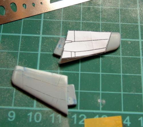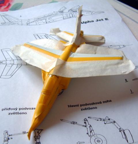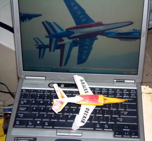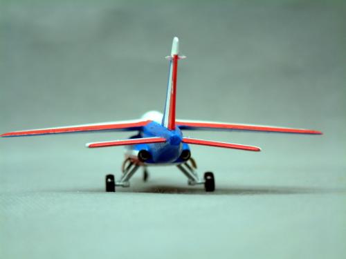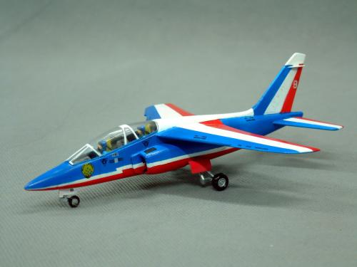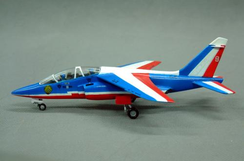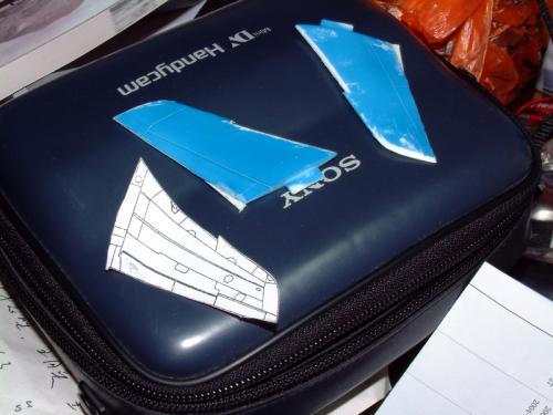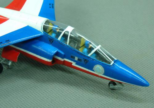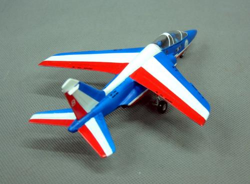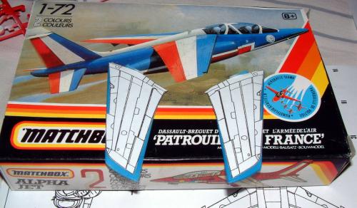 环球81年的版件+胶板+补土+郡士油漆 我们公司和法国领事馆是邻居,法兰西巡逻兵飞行员就住在附近的酒店,中午我们还和他们在一起吃饭所以弄到了预演和正式表演的门票。又从法兰西巡逻兵的随队摄影师处弄到了大量的法兰西巡逻兵的照片。 对比版件线图和照片发现版件的机翼部分与实机区别较大。版件为宽凹线缺失许多细节线条,主翼尾翼翼型完全不一样且没有提供发动机喷口这些只有自己修改追加,将线图缩到1:72复印多份再分别裁下机翼纸样贴在版件上供修改和刻线参考用用纸遮盖出机翼下的字样再喷蓝色由于水贴的年份久远除队徽和部分文字外全机采用遮盖喷绘。