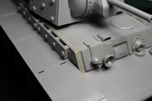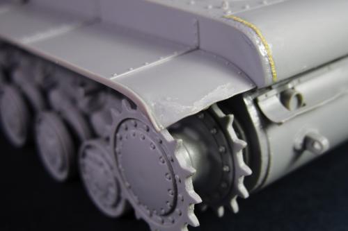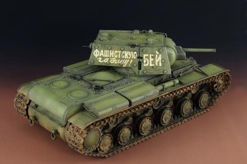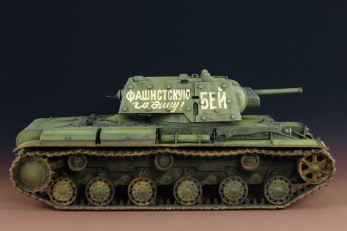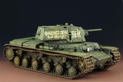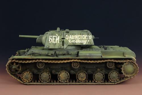 主要套材来自号手的00357,田宫水性漆整体上色,旧化大部分是靠MIG土完成的。 细节方面:我用流道重新制作焊线;钢板的边缘用电动打磨工具打磨出锻纹;又用打磨工具在坦克易磨损的一些地方制作较深的划痕;用香一点点加热受撞击的部位,使其产生变形;钢索头缺少钢索绕上去的细节,需要自己用铜线追加。 难点:最难的地方应该是苏军早期绿的配色上,我翻阅了很多历史图片,参照了很多彩图,经自己总结,调出了这种特殊的绿色,配方如下:加入少量的XF-3调出黄绿色,再用XF-26把颜色调得更翠一些,然后混入一些XF-81调橄榄色,根据感觉可以加入一些XF-62调出深一点的橄榄色,最后用XF-57和XF-60调出略带黄色的感觉。总之,根据网上的实物照片和包装的封绘,我认为二战早期的苏军绿是一种发黄绿的效果。 制作心得:号手的这套KV1,制作起来必须依靠电动打磨工具,否则过多的推出孔填补后,再用手来打磨,会累死自己的!另外就是溜缝胶在这个模型上产生了很大的作用,所有划痕都是用它进行最后腐蚀的,效果非常自然。 最后,就是希望大家能喜欢我这个绿色的感觉,谢谢!