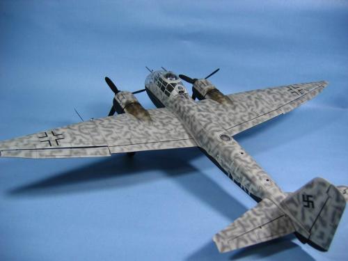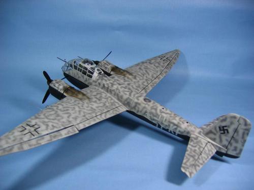 这次使用的是龙早期的套件,东西比较老,材质较硬,打磨组装都很麻烦。机身机翼的结合都需要大量的502和补土,难免会损失一部分的刻线,需后补上;主起落架在发动机仓内,组合的时候一定要注意步骤,否则后面追悔莫及。改造上面,坐舱内部根据资料增加了不少管线,座椅原件比较阳春,配套了失明的安全带,完成效果增色不少。原机枪的套件丢失,本想偷个懒从土豆那抢两个来,那鸟人逼我自制,无奈只好参照实物图片自行用胶版,1。0MM的铜管自制四个机枪出来;空速管原件也不好用,改用针管套合代替。坐舱盖密合不是很好,需矫正。 上色方面选用了夜间轰炸机的标准模式,上部314,下部消光黑,上部用101作了偏差,305做了迷彩。龙的水贴不错,就是稍微有点透色,垂尾上的万字是CM出品的。最后洗了一遍线,油画颜料扫出烧灼的黑烟。 照相的背景纸和相机都是和土豆借的,先谢谢拉