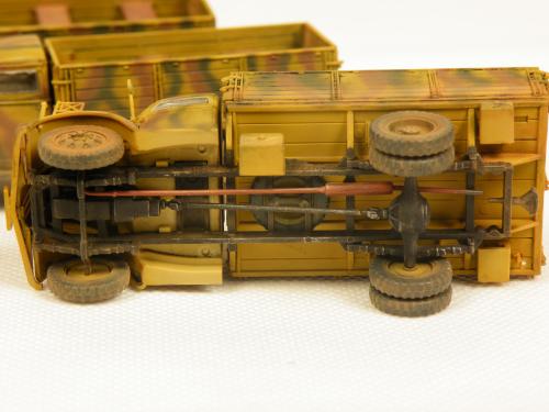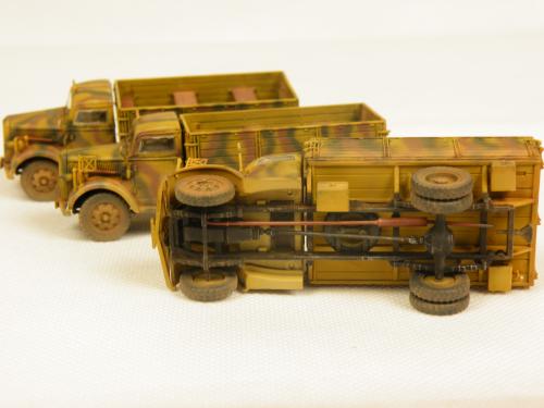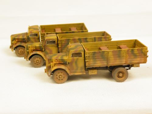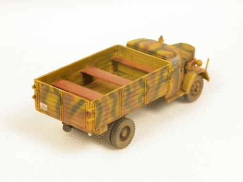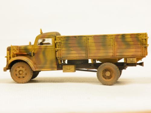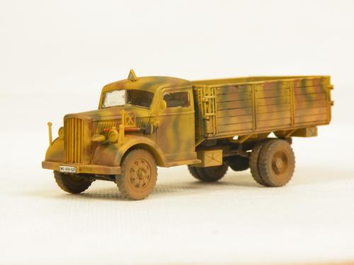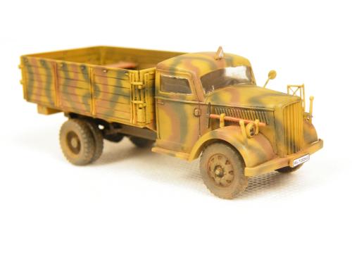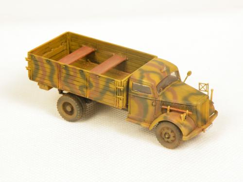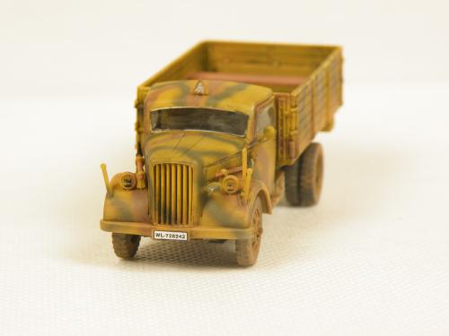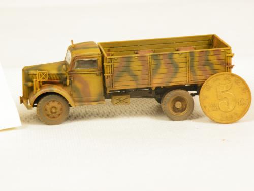 这次的套件使用的是爱德美No.13404 1/72比例的德军欧宝卡车,套件里提供了早期和后期两种车头,我选择了早期型的制作. 整体来说这套模型的组合度一般,车头部分和底盘的组合度都还不错,但是后车厢的组合度有点问题,需要进行一定量的打磨. 我这次在制作中尝试了喷涂三色条纹迷彩,但是因为技术较菜,喷出的条纹还是太粗了点,看来以后还是要多多联系条纹的喷涂才是,其他方面因为是帮朋友制作的模型,鉴于朋友的要求,这次没有进行掉漆和流锈等旧化效果的制作,仅仅是漬洗和干扫而已,算是一个小小的遗憾吧~ 本着重在参与的心态来参加比赛,也借此机会向大家学习学习,还请大伙多指导~谢谢啦!~