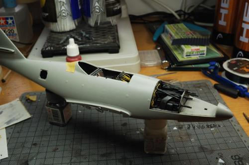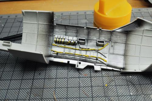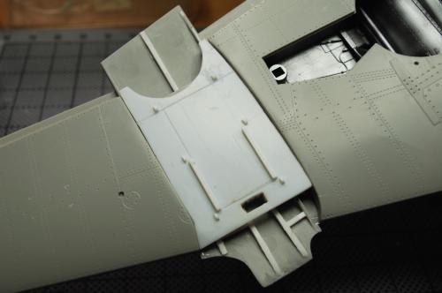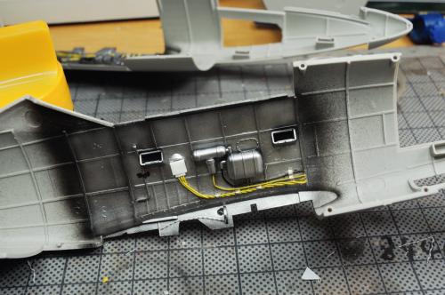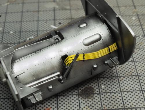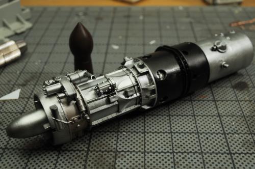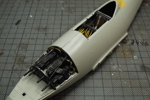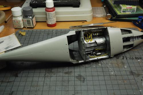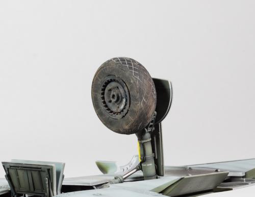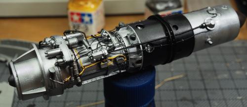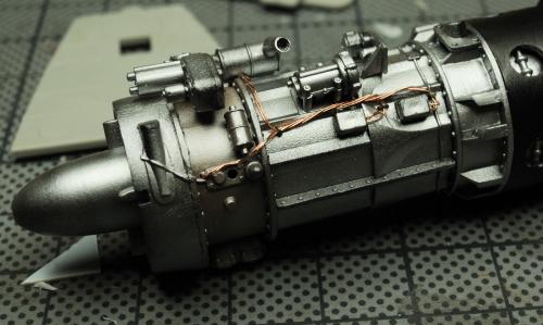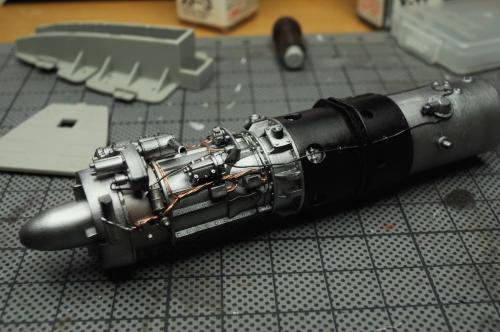 制作中主要进行的改造有:发动机添加管线和自制细节,机炮舱和轮舱添加管线,改造起落架液压部分,自制空速管,O形电线等。另外由于打算以此飞机为基础制作情景模型,故将左发动机做成完全打开展示状态,自制了发动机舱内部细节。