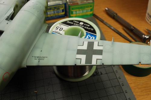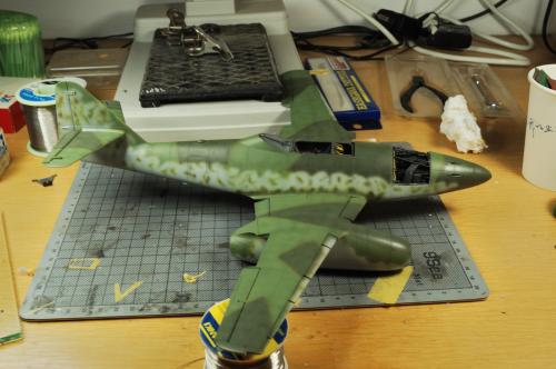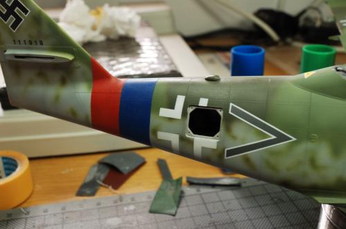 铁十字标志,战术编号和帝国防空识别带遮盖喷涂,万字标志和JG 7标志采用水贴。田宫珐琅漆渍洗,极细面相笔点掉漆。轮胎部分用mig土干扫。最后全机喷君士182号消光漆保护。
