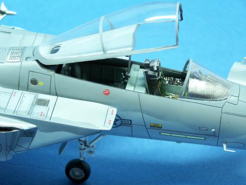 相当的不错! 有几个小地方注意一下更好: 鸡头的雷达罩上的布列天线有点稍大了,细点更好; 后视镜和把手都加细了,安全带可以再作好一点,有点假的~; 雷达的管线都加了,起落架上也可以增加刹车线; 迷彩的分割稍微有点硬; 水平尾翼上“NO STEP”的标贴的位置有误阿~~