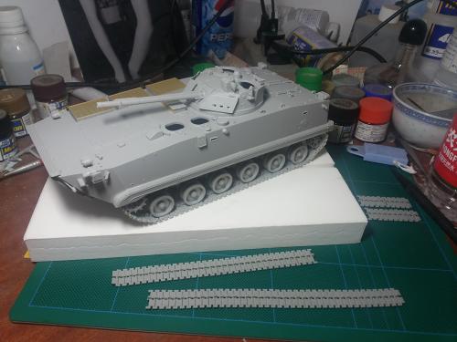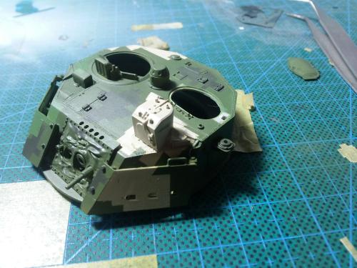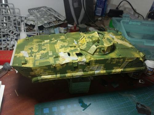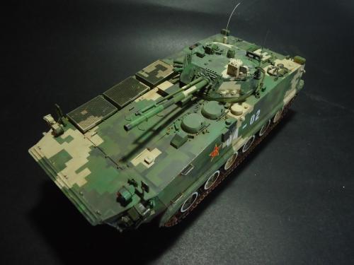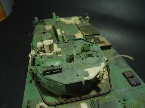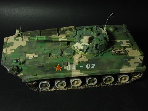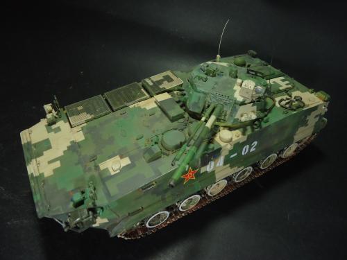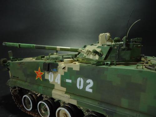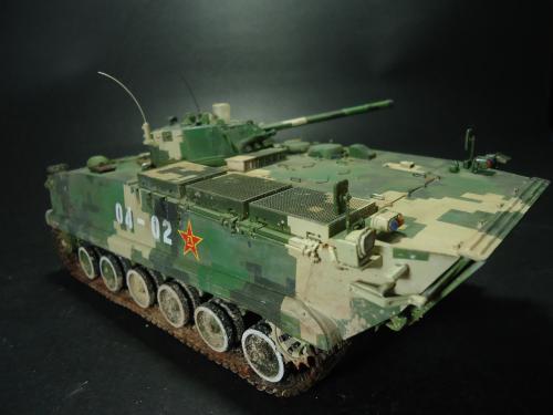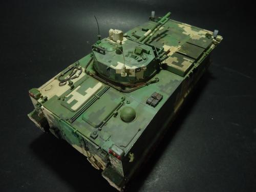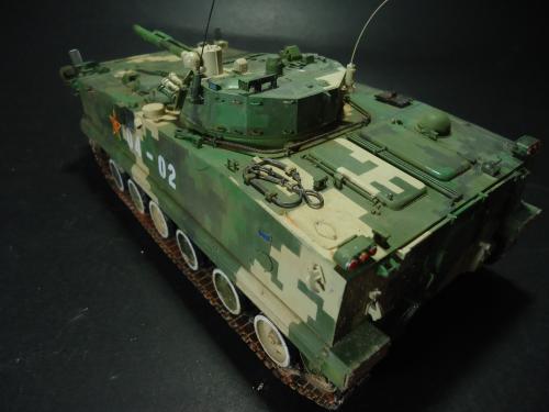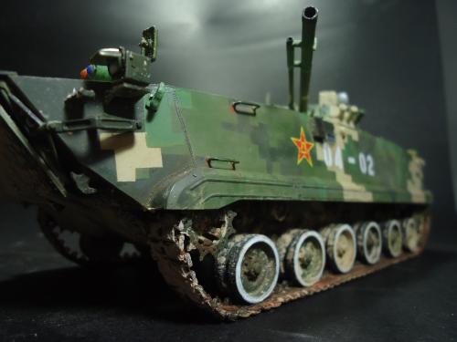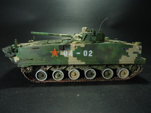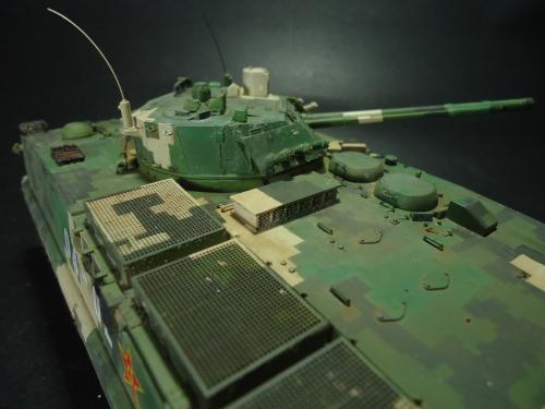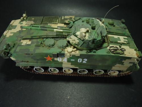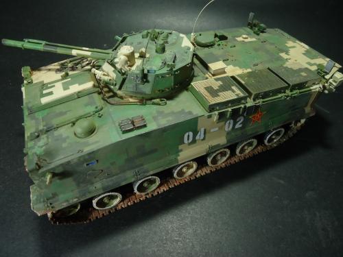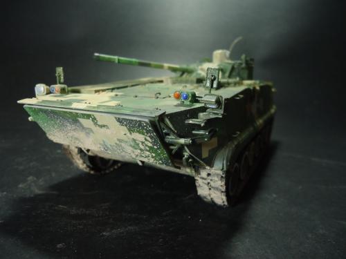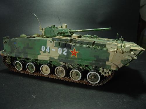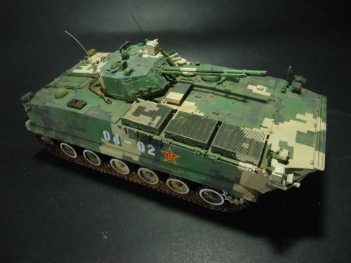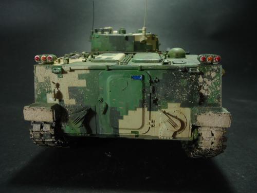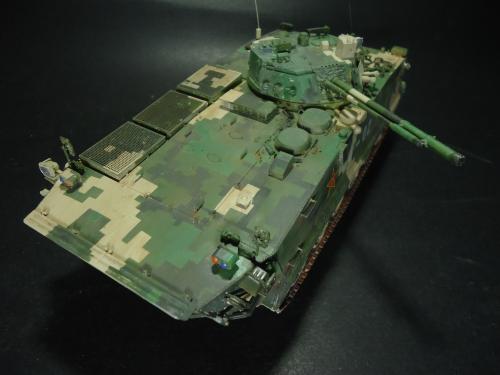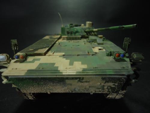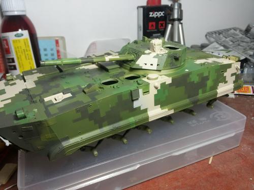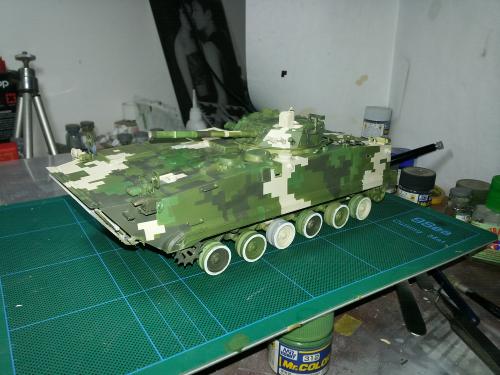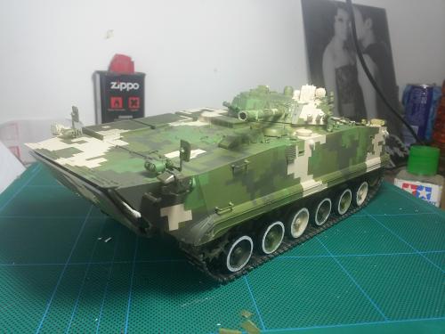 HB的板件,直做无修改,板件的组合度还是很不错,基本没有什么需要补土填缝的地方。 数码迷彩涂装遮盖让人几近崩溃^-^拖了好几个月才完成,有的地方还重新做了补漆。 经过一个月的完善迷彩涂装,整车涂装总算勉强入眼了,将涂装前拆下来的小零件上色之后装上去之后,再将拼接履带一节一节的装上,上色。 虽然做的是阅兵涂装,如果不做旧化的话,车子看上去太扎眼了,所以只是简单的做了点滤镜和旧化,再加了点泥浆效果,不过在做泥浆效果之前居然忘了贴水帖标志了,所以又只有将车体两侧的泥浆效果擦去,贴上阅兵时的方队编号。 最后总结下,HB这款车组合度和细节都很不错,价格也很公道,只是因为我平时很少做AFV,再加上这次做数码迷彩,遮盖时很费时费力,需要极大的耐心和毅力,不过做好了的数码迷彩效果是很出众的,虽然我做出来的效果还很差强人意,不过自己还是很满足了。战车的旧化对于我来说也是一个新鲜的课题,手法和技法都很幼稚,还需要多多实践。过程图比较少,而且基本是用手机拍的,效果都不太好还请各位谅解。总之就这个模型而言我自己还是很满意了。