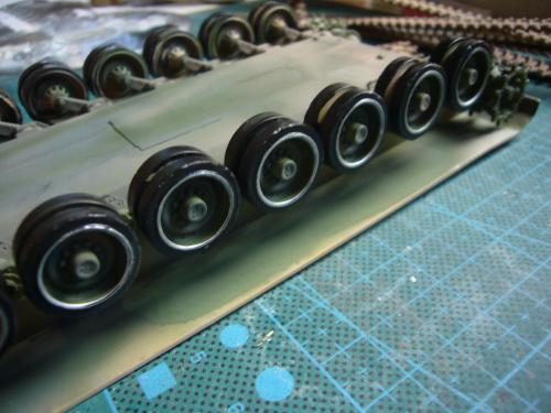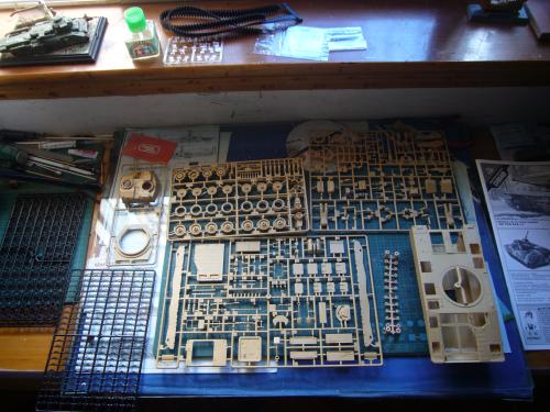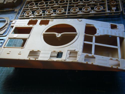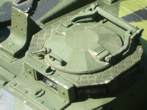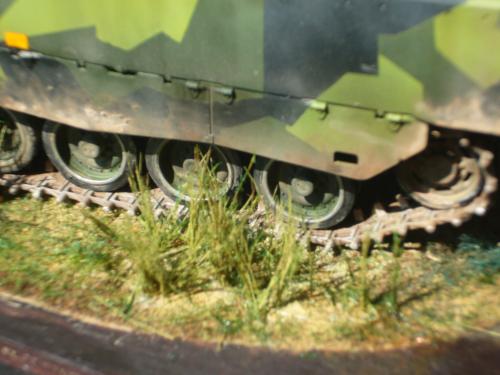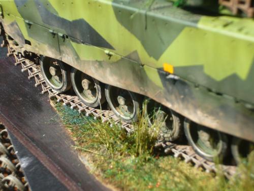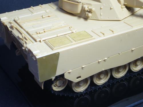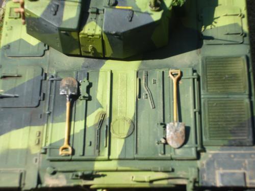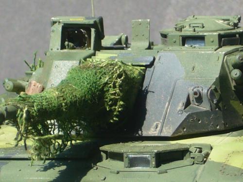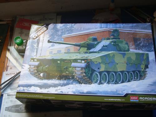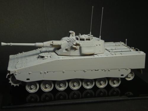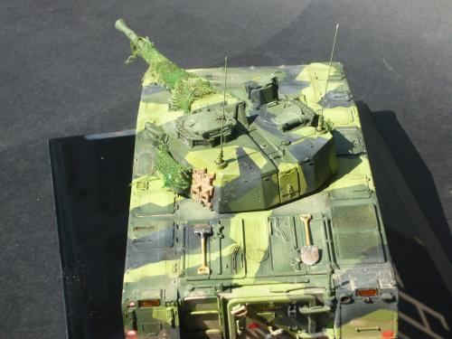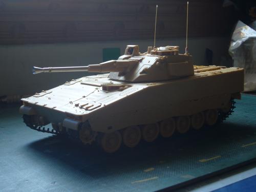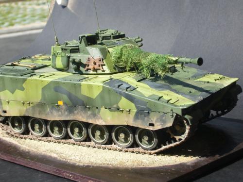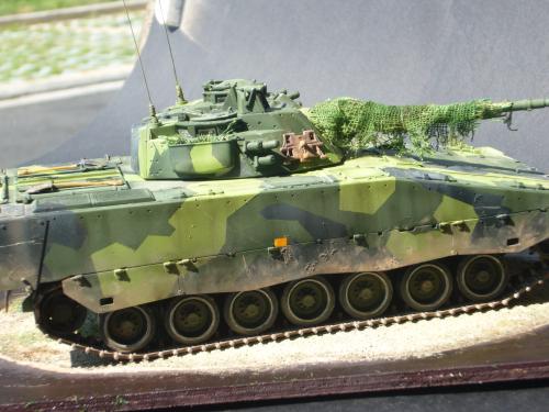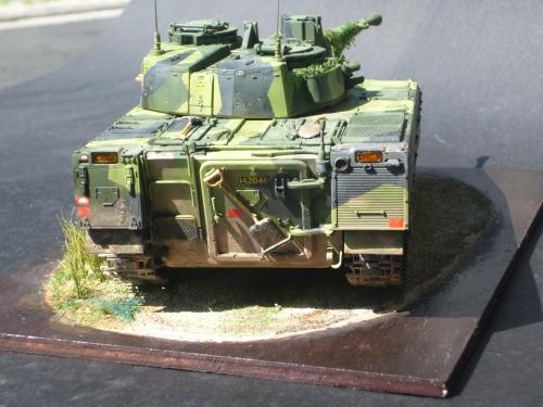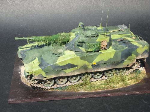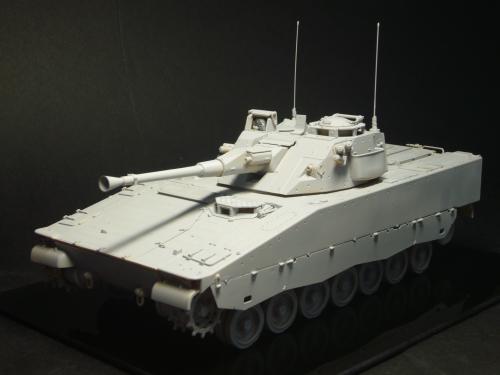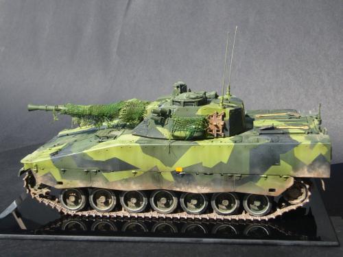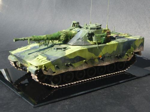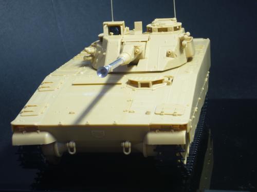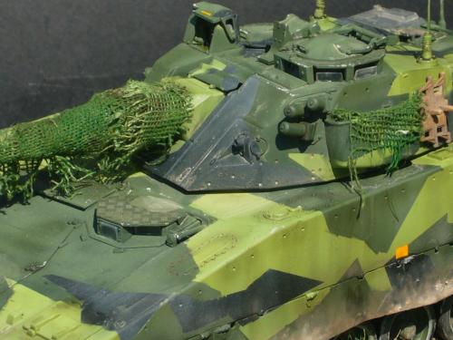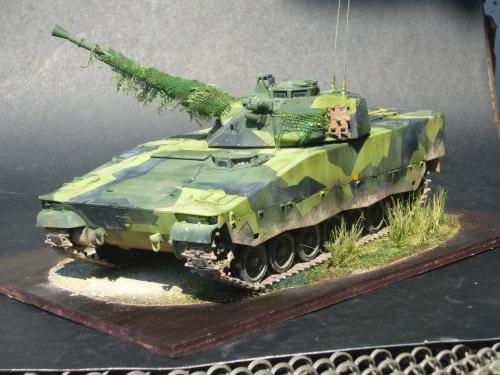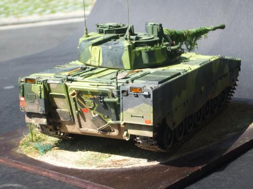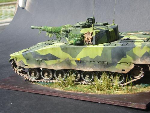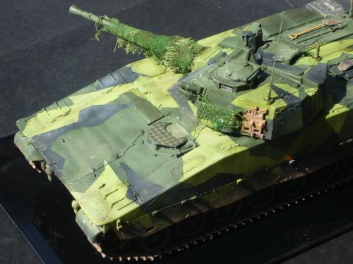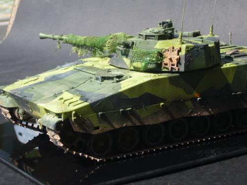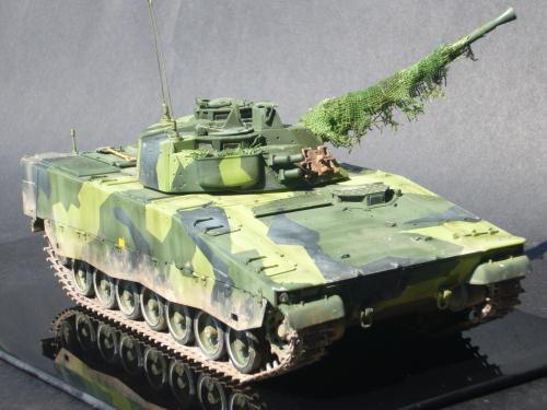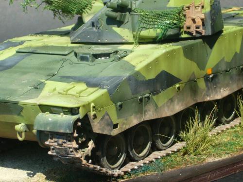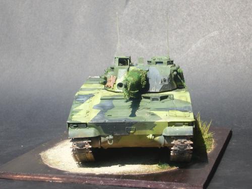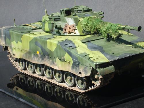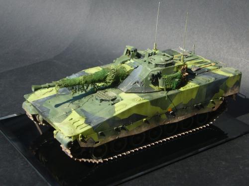 看到现代战车这个主题,脑子里蹦出的就是CV90这款战车。前卫的外形,夸张的数字迷彩,再也适合不过了。 套件使用爱德美出品的CV90,本是冲着它的灰色塑胶套件和两个兵人而去,结果开盒却发现是黄色板件,兵人的刻画一塌糊涂。。。。。好在还有附赠一小块蚀刻片,和一根金属炮管。 细看板件,整体感觉细节都很弱,该凸的不凸,该凹的不凹。好在转折还算锐利。 前引擎盖的缩水是套件最大的问题,其他都还勉强,组合度也勉强,素组比号手轻松得多,只用三天就完成了素组,包括履带。 全车补土后开始上色,上色使用田水,颜色全都是自己调配的,没有参考色号。先喷涂最深色,此色使用北约黑加少许蓝色调配,在喷涂色块需要面积后顺便做了预制阴影,剩下涂料调浅后用类似CM的方法喷出高光,然后对深色遮盖,喷涂最浅的绿,遮盖后喷涂最后的橄榄绿 履带使用XF-52泥土色喷涂,之后沾上橡胶垫,非常方便的完成了履带分色。 路轮外缘橡胶分色用笔涂完成,之后笔涂银色金属圈。 完成主色之后,我使用了后置阴影加强效果,增加色彩变化,具体做法就是用X-19烟色细细的喷涂在线条边缘位置,色块背光面,体块间明暗交界线,还在车体侧面纵向喷涂增加雨痕。 之后使用油画颜料做车体浮尘,类似罩染法。这次制作没有滤镜。最后用MIG土增加行走部分泥土。