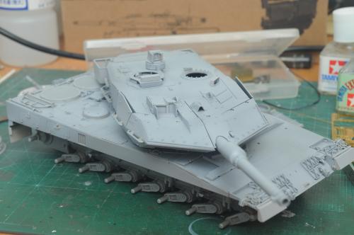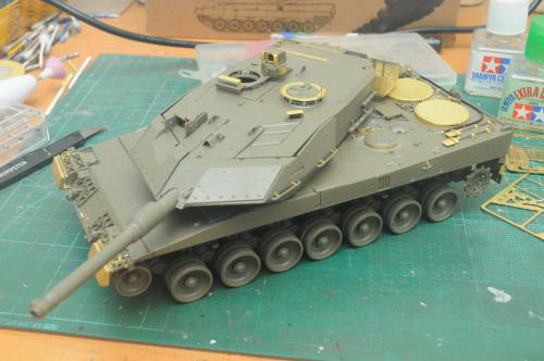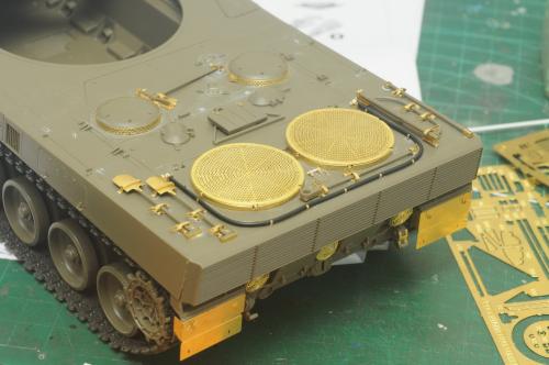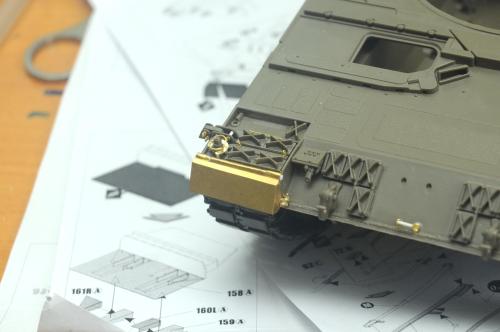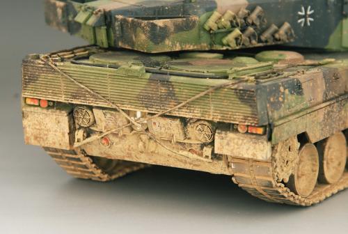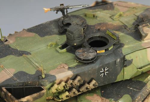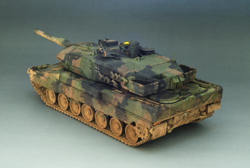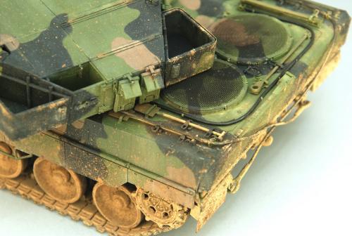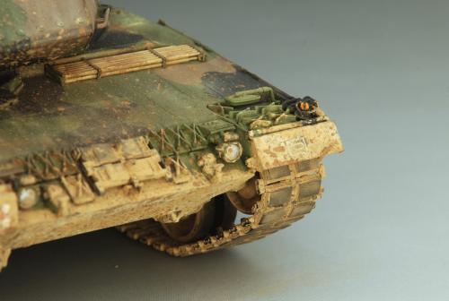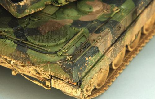 使用田宫套件,另加沃雅的pe套改、号手的活动履带和AFV的潜望镜贴膜。 制作过程比较顺利,pe的细节表现不错,特别是车身后部的表现很不错,由于第一次用潜望镜贴膜,而且AFV的尺寸也不太合适,剪剪裁裁的才勉强对付上,号手的履带感觉还行,制作也简单,装上后效果不错,可惜没有改活动悬挂。 上色使用了北约的三色迷彩,参照一张网上的照片做旧成在湿地越野后的效果,行走部分用天然土做出了干、湿泥,侧裙和炮塔表现出泥浆飞溅的效果,完成后总体感觉有些过火了。 第三次参加战车的比赛,重在参与,以后还要多多学习!