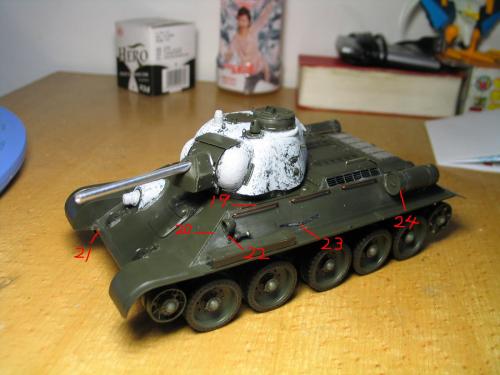 这次制作的OT-34是安装了ATO-42型喷火器的 车里雅宾斯克拖拉机厂生产的T-34/76 1943型,炮塔与一般的T-34/76 1943型不同,炮塔中部下方略微向下延伸。由于安装了ATO-42型喷火器,车体上的无线电台被移到炮塔后部,并且安装了车长指挥塔。我手中刚好有协和出品的T-34写真集,有两张该型OT-34的历史实车照片,发现其炮塔不同于一般的车里雅宾斯克生产的炮塔:指挥塔超出了原有的舱盖,要在指挥塔附近加装一部分突起;炮塔两边要加装类似T-34/85的炮塔起重吊钩;无线电台机座移至炮塔后方。