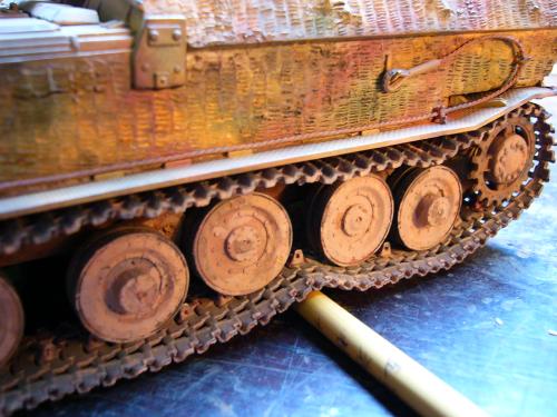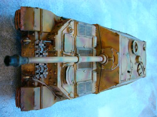 这是为场景作的,使用威龙套件,用保利补土做的防磁,履带钻孔做活动,舱盖、悬挂、行军固定架均钻孔做活动。当时懒得查资料,按封绘作的防磁,完成后发现与资料不符,只好将错就错了。用松下F-1(300万像素)拍的,效果一般,细节没法看。