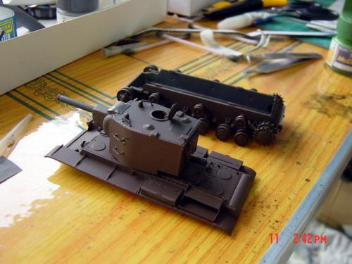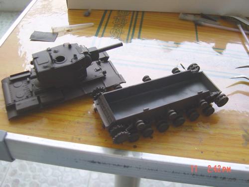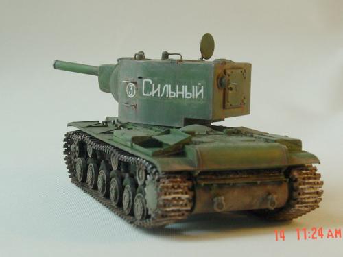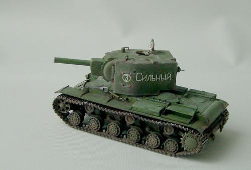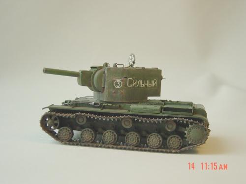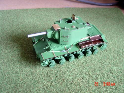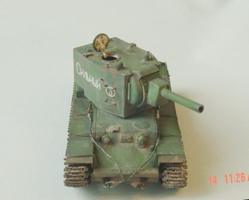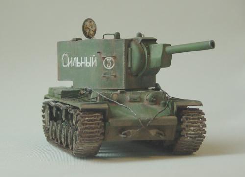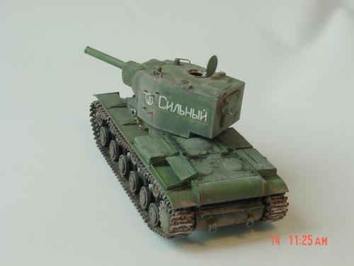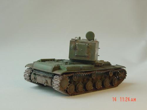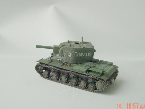 此车属于1942年7月蓝色方案开始时的布良斯克方面军第7坦克军第3近卫坦克旅的一辆KV-2。 KV-2型坦克装有1门M-10型152毫米榴弹炮。之所以采用这样大口径的火炮,其目的是为了能够摧毁敌方坚固的防御工事(譬如芬兰的曼纳海姆防线)。但这也使坦克的炮塔变得特别巨大,不仅导致车体行动不便,而且看上去宛如一个立在坦克底盘上的小房子。因此就有人给KV-2坦克取了一个不大文雅的外号“公共厕所”。 使用套材为PST No:72017的1:72系列苏军二战战车--KV-2。中途又购得PART的蚀刻片用来加强细节,工具箱、翼子板支架、进、排气口网罩、炮盾防雨罩等等都是蚀刻片,原蚀刻片的登车扶手太薄弃置不用改为铜丝制作。最精彩的是发动机盖板上的提吊环也可改为蚀刻片还是可动的。152MM的炮管和拖曳钢缆为老熊提供的金属炮管和铜丝缆绳。PST的板件组合度不错细节尚可,大量的蚀刻片的处理是整车的难点,1:72的蚀刻片十分细小,花了我大约一周的业余时间处理。但完工后效果的确不错。 在上色处理时先喷底色,在喷郡士的苏军早期绿,采用滤镜法渍洗后,又尝试用新购得的天然土再做一遍滤镜旧化。包括底盘、履带、车轮的泥污,发动机罩、进、排气口上的油污,整车的锈痕,整车混色。拍照时天气不好影响了效果大家见谅。另外PST的水贴纸质量不是很好也影响了旧化效果。 整套模型耗时约3个月时第一次尝试1:72的战车蚀刻片和天然土旧化技术的使用,希望大家多多指正。