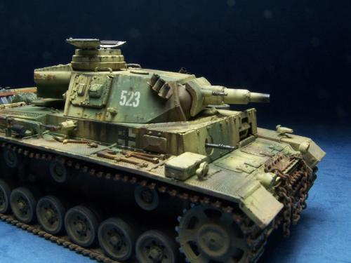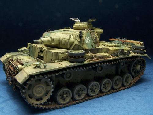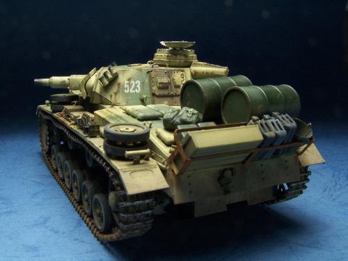 使用了港龙的3号J的车体和一支多余的3号M/N套件内的75MM炮管,另一套沃雅专用的蚀刻片。重新焊接了装甲,并用铝片制作后扰流板、杂物支架和小水桶。上色花了不少心思,住要是喜欢重洗,所以用洗液描绘了很多次,钢板的磨损用粉彩黑色制作。其他似乎和别的模友手法一样,就不罗嗦了,平时很低调,这次斗胆参加一次比赛,权作是响应周围朋友的怂恿吧!