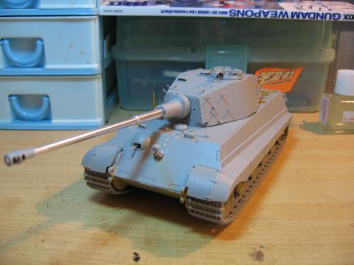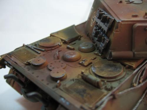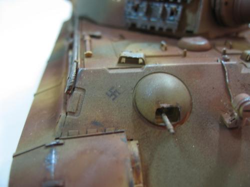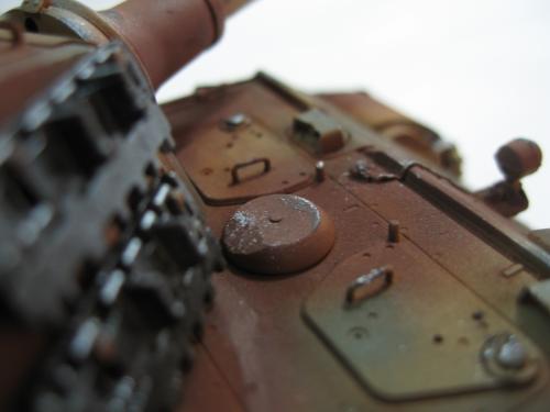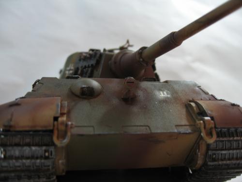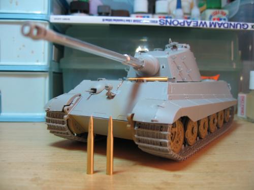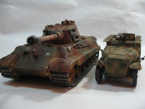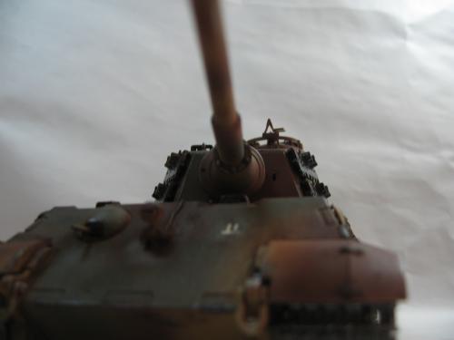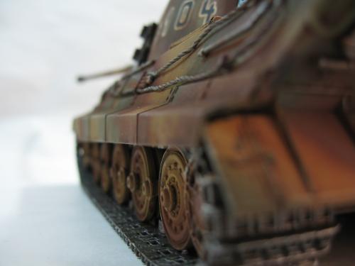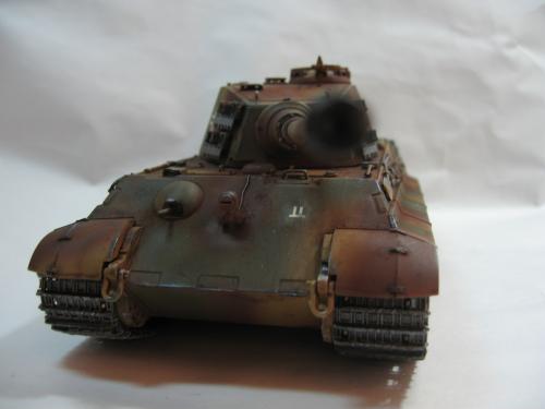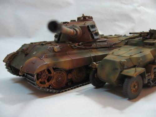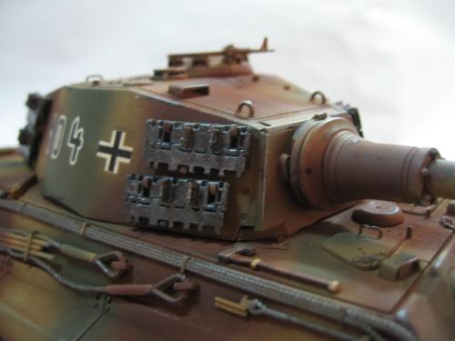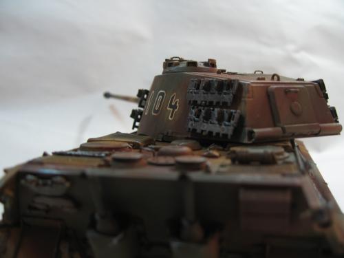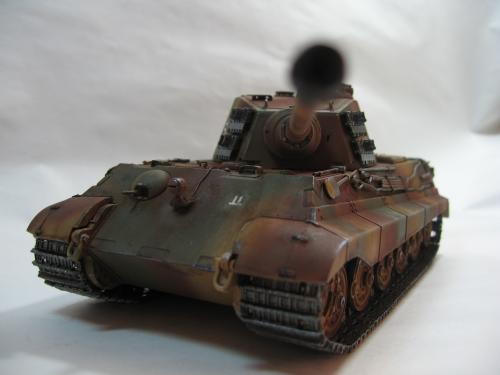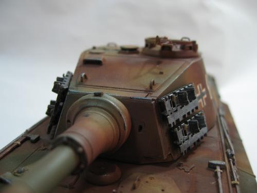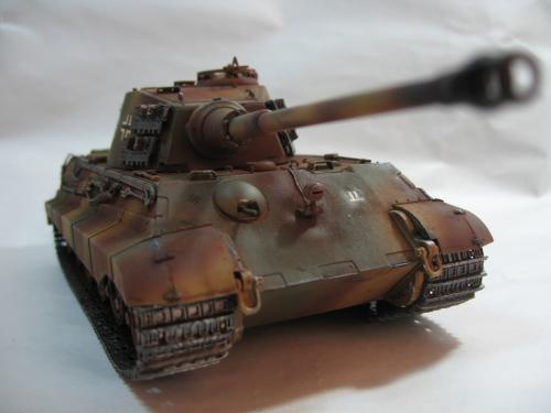 制作的是龙的亨舍尔虎王. 加了车灯线,发动机防护网用蚀刻片,钢缆用铜丝的,猪头鼻防盾下的通风扇保护盖根据实际做了切削,驾驶员的潜望镜保护板后侧同样做出了切削的痕迹. 用光影喷涂法,高光用加了白色的底色来喷,旧化用ZIPPO煤油加油画颜料洗,滤镜,银色干扫车体及履带,最后消光.该车我做成是党卫军第二帝国装甲师的战车,车辆徽标是1943年以后使用的,另外车体前的小万字是我自己加上去的(漏喷的),实际是没有的.