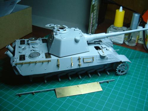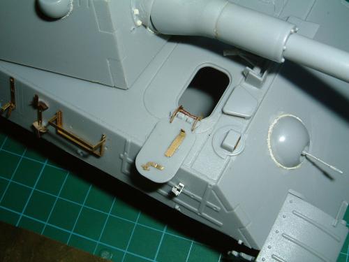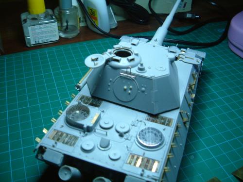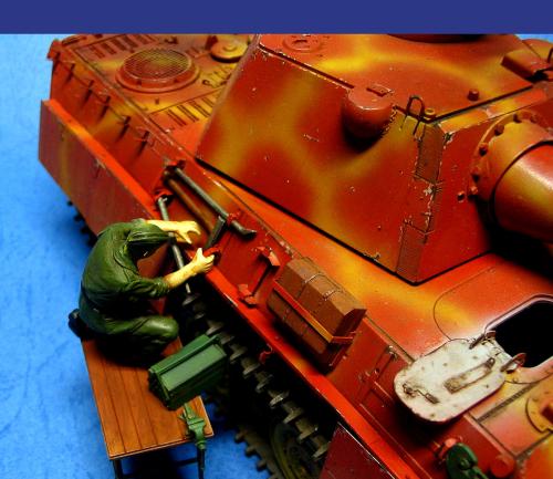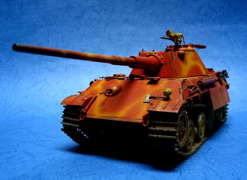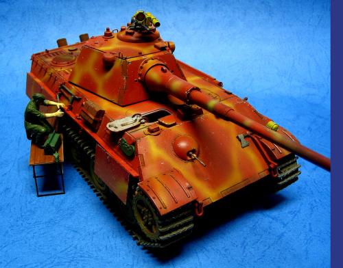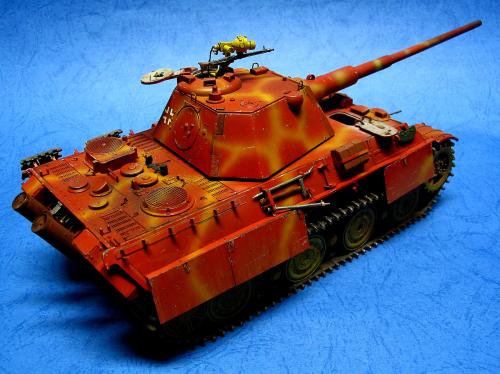 因为电脑故障20号19:00才传完好险!废话不说了。1945年4月,苏军向柏林发起总攻。为了挡住苏军的铁骑,德军将在实验中的豹2战车推向战场。全车采用二战末期在红褐防锈底层上喷暗黄色条纹的涂装。豹2做为德国的末日战车其完美的防弹外型加上88炮的威力使它象战车中的太阳一样的耀眼,可惜生不逢时只能成为天边的斜阳在人们的记忆中留下一种凄美。全车用威龙套件,沃雅蚀刻片。用树脂钉在炮盾和炮塔后舱门上追加铆钉。用AB补土在炮塔和前车体上追加焊线。用蚀刻片做出发动机上的编号.