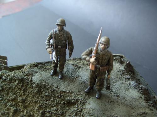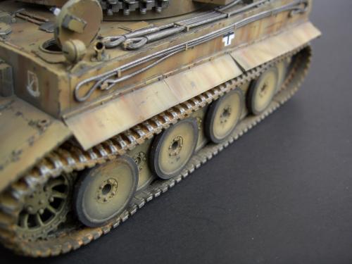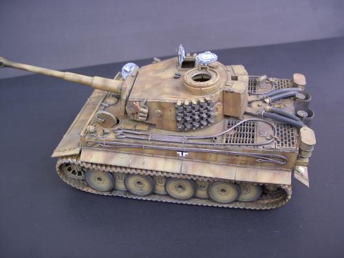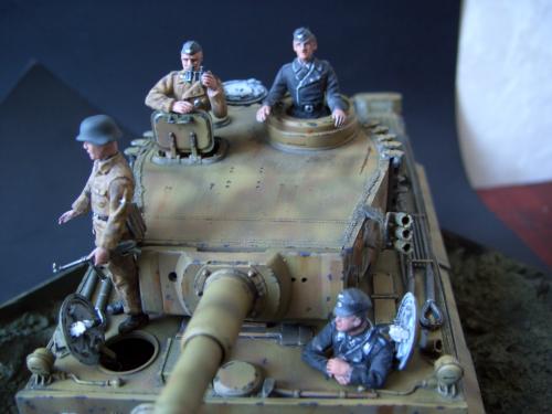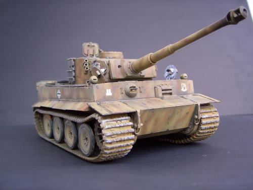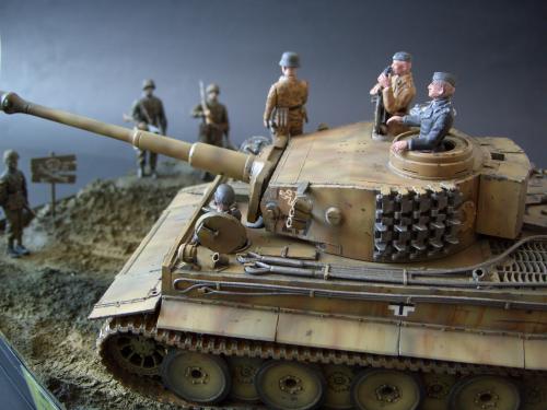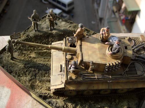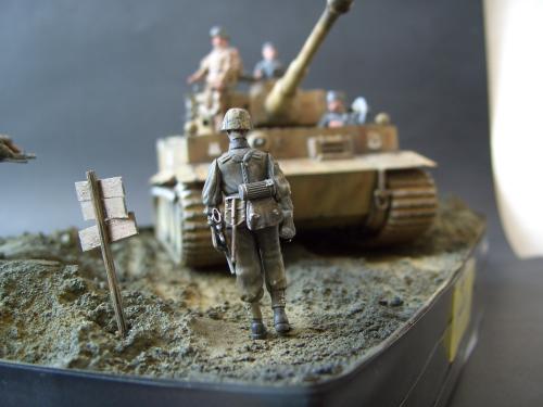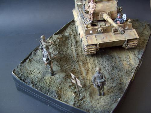 采用爱德美的1386套件,没有使用蚀刻片,只简单的追加了前灯的管线,侧裙板自己手工切开分别安装,追加了炮塔和前车体的焊缝.全车素组,完成后顺便做好随版件带的兵人,最后索性加了几个小号手的兵人组成一个小场景,没有经过考证,自制警告路牌,纯属YY.作品名为"询问",其意为:一辆坦克正在行进,突然发现前面路旁的警示牌,正犹豫间,刚好遇到几名满身征尘,经过一场恶战的士兵,于是车长令手下询问前面的情况.(本人从事模型制做仅六个月,本着学习的态度参加这次比赛,重在参与,还望老师多多指出不足.)