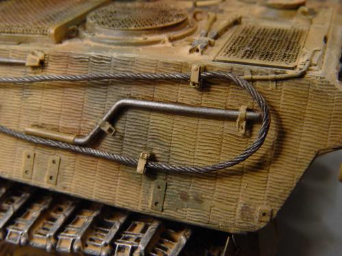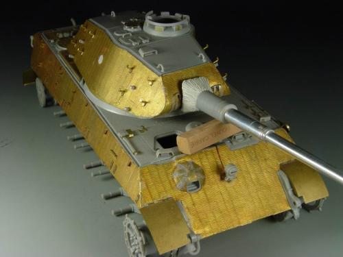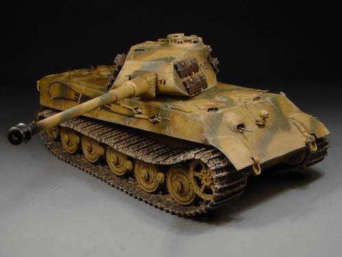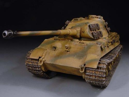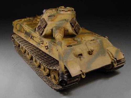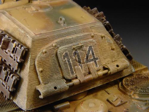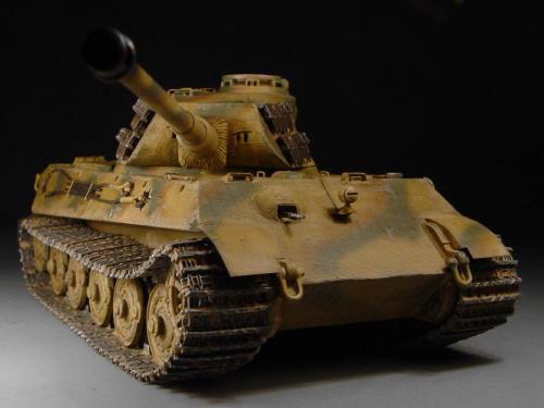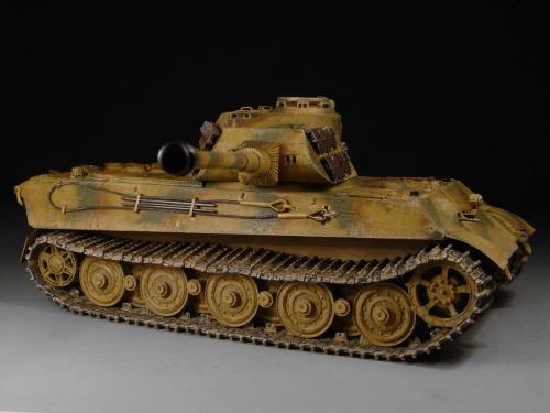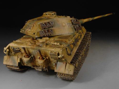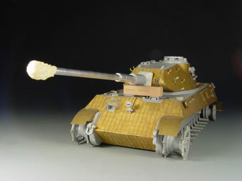 这次比赛是88主题,我也可以把烂尾一年的虎王给解决掉了。去年在绵阳学习时,虎王的索组就已经完成了,改造的重点是活动悬挂、履带和蚀刻片加细。后来觉得需要加做防磁,可是所有蚀刻片都已经沾在车体上了,难度很大啊。没有办法,用防磁蚀刻片吧。从新时买的牛魔王片子,在车体上沾好后,加上银色的金属炮管,整个虎王金光闪闪,富贵逼人。看得眼花,怎么也舍不得上色了(模型加上炮管、蚀刻片、防磁片子和金属履带,整个虎王价值400左右了)。 上色参考了说明书的彩图,就做114号车。几种颜色都是自己用君仕漆调的,现在感觉好像艳了点。旧化整体先洗再扫,在没防磁的地方做滤镜,然后描掉漆。这次没用天然土,而是用了真正的黄泥。可惜好像效果不是很好,黄泥浆干了后容易结在一起。哎呀,试验失败了。