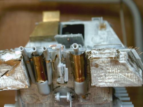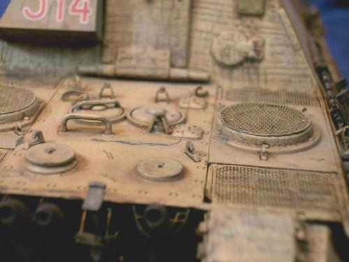 1.组装完后先在蚀刻片上喷涂金属底漆, 2.上1000号水补土, 3.用2号黑色喷底色, 4.上砂褐色,上的基本色是自己用郡士和魔王漆调的,旧化后颜色会变谈,所以明亮度需要大点,喷的时候留出阴影,然后再加白色喷出高光. 5.用象牙黑泽洗, 6.用灰色点出掉漆 7.用土黄,赭石色,橄榄绿,棕色等做滤镜 8.用银色黄色加白色在部分突出处干扫 9,最后上粉彩,消光.