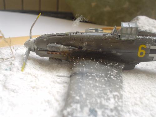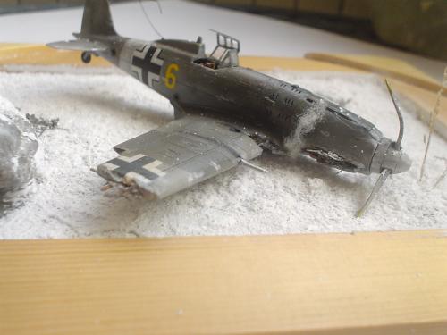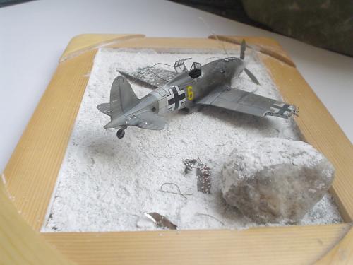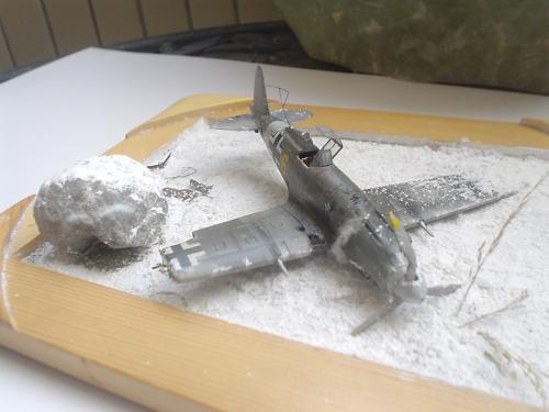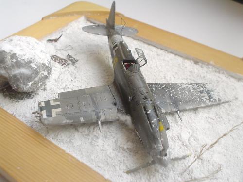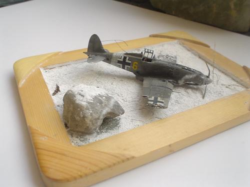 意大利的板件,制作上不算特别愉快,但基本还是比较顺利得完成了.制作到最后不幸遗失了透明件,只好自制.相对于原件,外形可能有所偏差,但能更好地表现厚薄(原件实在厚得可以了) 全机加深刻线,并根据线图补出机翼上的刻线和铆钉. 坐仓中,追加了管线和安全带,并用补土表现了坐垫. 机炮仓排气口使用电烙铁加深后塑型,取得了更好的表现效果.尾轮处两块起落架仓盖用铜皮替换,原件太厚弃之不用. 改造的重点在于三处内构的表现.翼根,翼尖和发动机仓.发动机使用铁丝、铜丝、铝薄、胶板、流道自制。效果还算不错。另外两处内构是用刀笔抠开后追加铁丝、铜丝表现的。天线将其折断,表现迫降损毁状。同时,螺旋桨全部向后弯曲,并抠出破损。制作和改造基本在五月完成。在机身侧面抠出弹洞。上色已经是六月底的事了。 照例全机喷1000号水补,涂装没有采用说明书上的几种样式,而是参考了资料,决定做一架德军装备使用的MC-205。于是特地买了一架爱的BF-109,使用里面的水帖纸。比较失望的是里面没有万字……而根据资料,垂尾上是有万字标识的。 喷涂完毕后上水帖、点掉漆、洗、上粉、消光,不用多说~ 最后流道拉丝拉上天线!~飞机制作告一段落。(据说MM的头发效果更好:) 与飞机同时开工的还有地台,拆了个相筐,(放毕业照的,心痛ING……)抹上白胶,撒粉笔灰。。。。PS。那块石头是皇居,也就是天皇皇宫门口拣的,嘿嘿