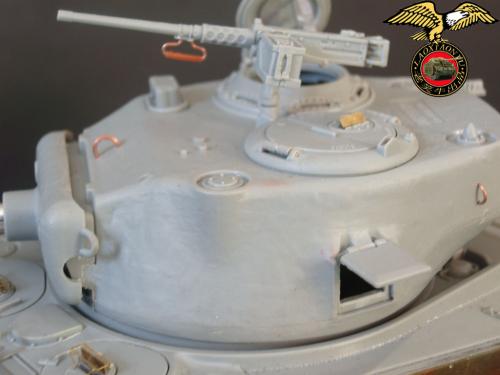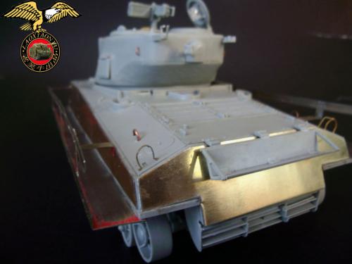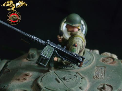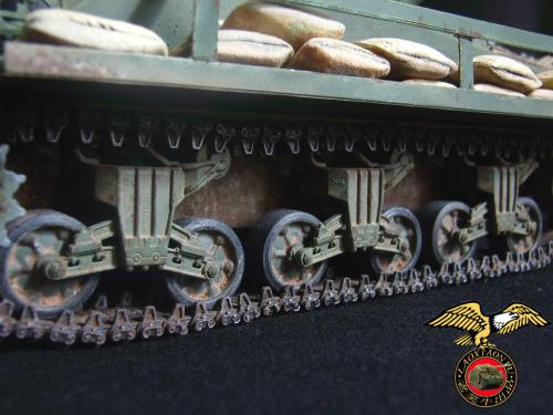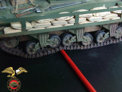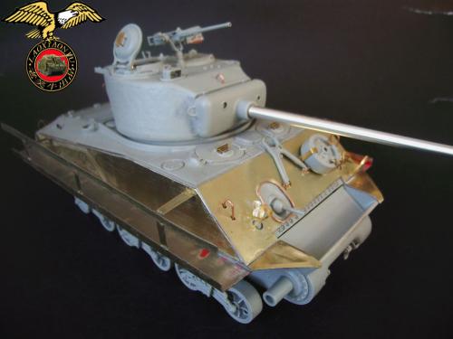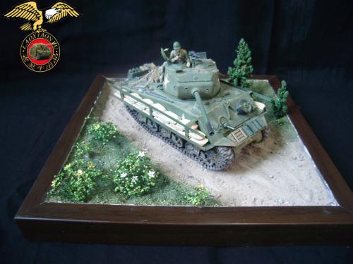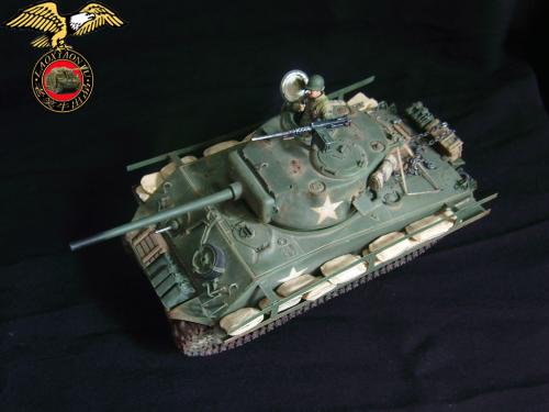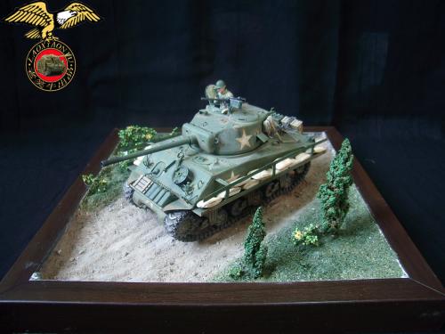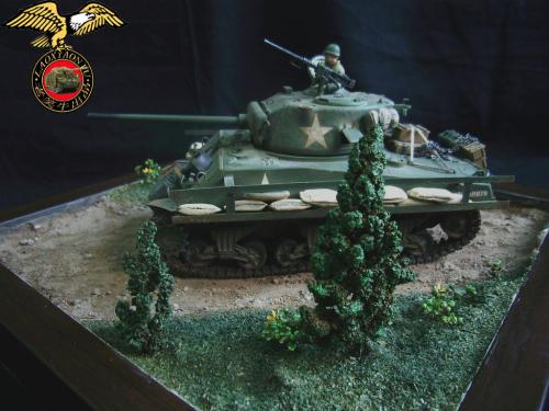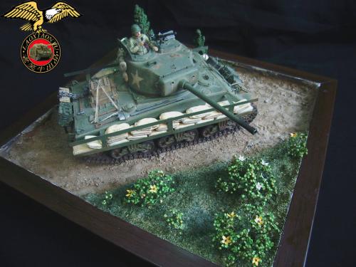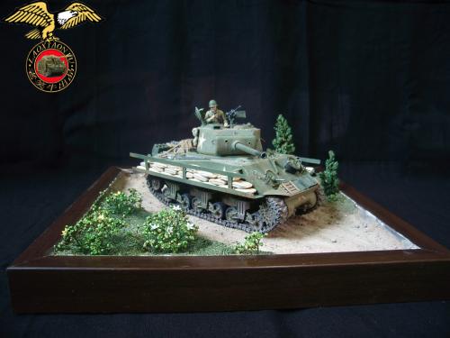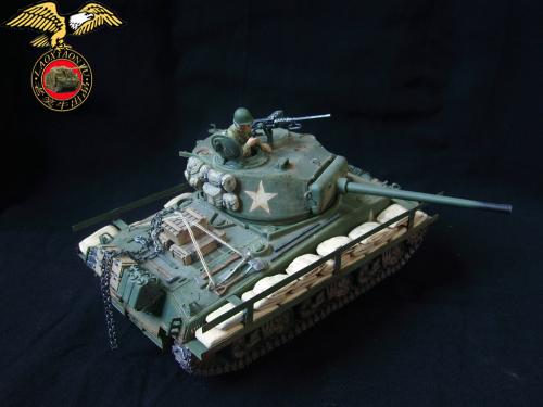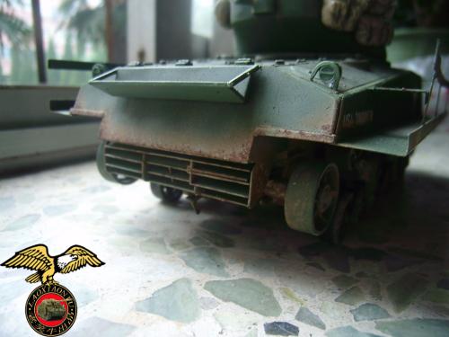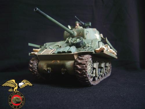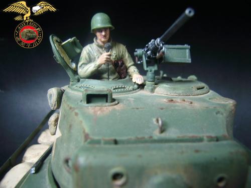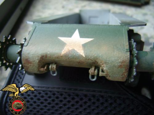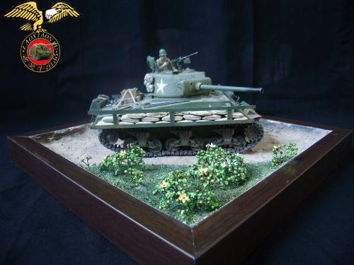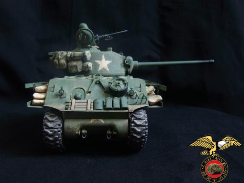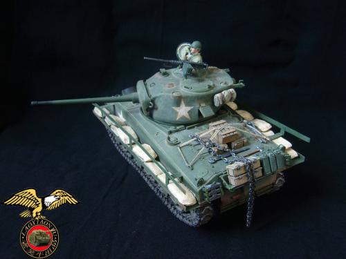 板件用的是龙的6255M4A3,组合上没有很大的困难,不过,素组很慢,时间都花在改造上了。制作中因为对历史资料未加考证,结果犯了一个严重的错误,后期的车我居然安了前期的负重轮(大家可以在素组照片上看到),结果冒着战车毁掉的危险把负重轮换过来了,在这里非常感谢毛毛虫的提醒。在改造方面除了使用模型自带的PE,还使用了自制的PE。舱门全部改成了活动的。最大的工程就是手钻履带了。对我来说做模型最大的快乐一是以自己有限的能力来完成改造方面的问题,没有必要全部拿钱来解决(纯属个人意见);二就是在完成品出来以后,达到了自己的预期效果,这个时候的心情是无与伦比的。在涂装上采用了常规的美军绿,然后用油画色渍洗、干扫。最后旧化:点掉漆、流锈、滤镜。 对于情景得设置各位看着可能有些不协调:一个是战争机器,冷酷无情;一个是花草树木,生机勃勃。不过我要的就是这种不和谐的效果。试想,在战争时期有多少不和谐的画面映入我们的眼帘,侵略、杀戮比比皆是。本来美好的家园让侵略者无情的践踏。场景中的绿色植物和美丽的花草象征着和平的景象,而那部无情的战争机器在这里却代表着正义为了美好的家园和世界的和平冲向前方。