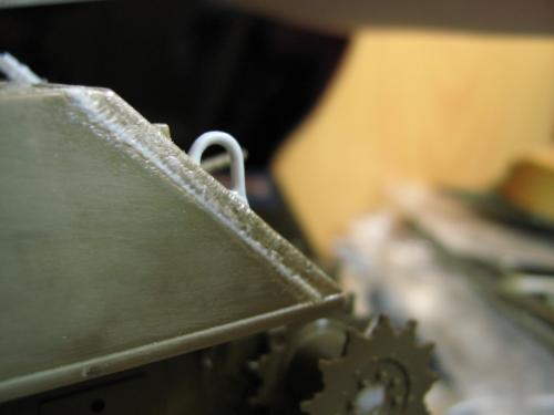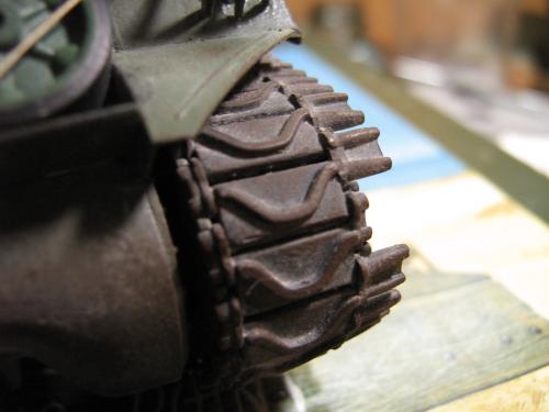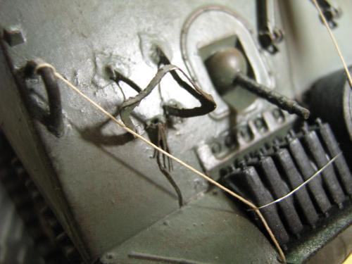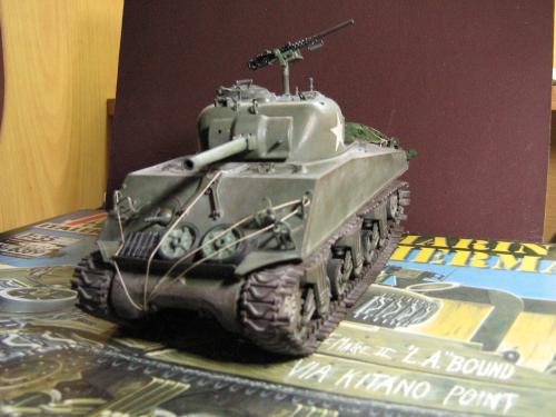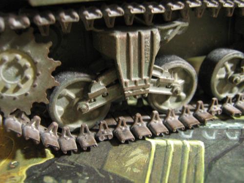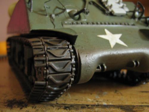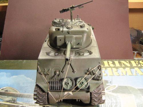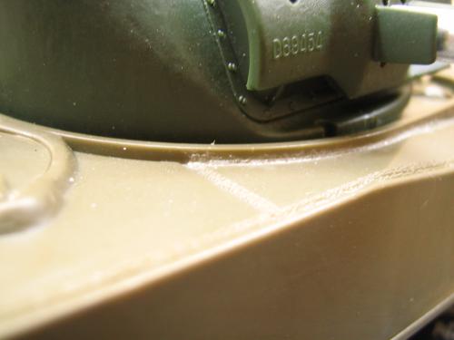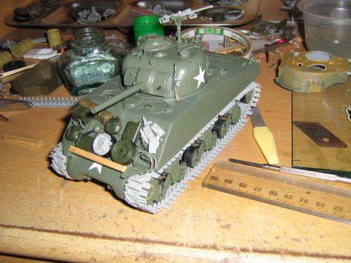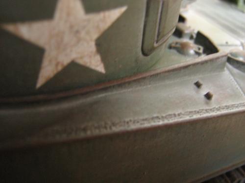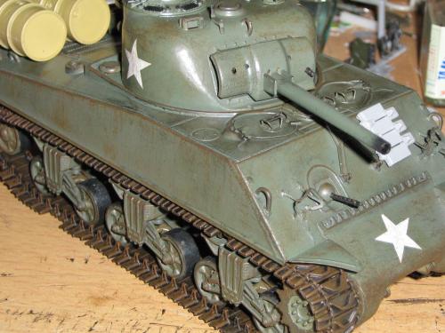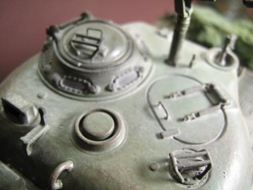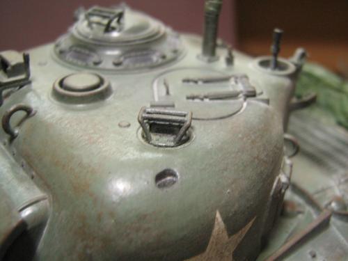 意大利的炮塔错误太厉害,舱盖小了一圈,直接废弃,选用了爱13203的炮塔,爱的指挥塔太高,换上了龙6121中多余的指挥塔……改造了龙M4系列中经常出现的T62履带为T54履带。全车狠扫,没洗,上了点儿土来模拟城市作战中经常出现的混凝土灰尘,改造了车尾的支架,按照日本模型制作片里的方法做了车尾的杂物~新手,第一次实战,好歹还是整出了一辆战争最后阶段,在德国城镇巷战中坚持的M4A3(75)W最后期型~
