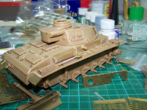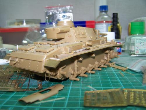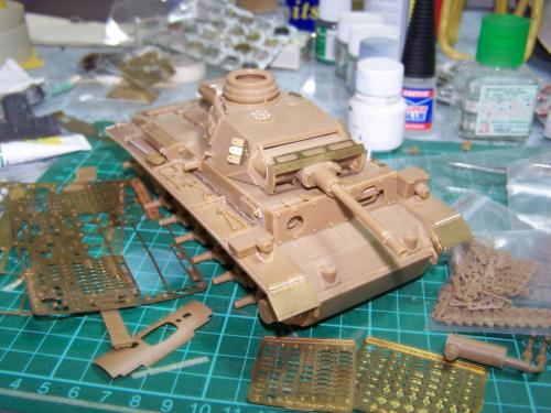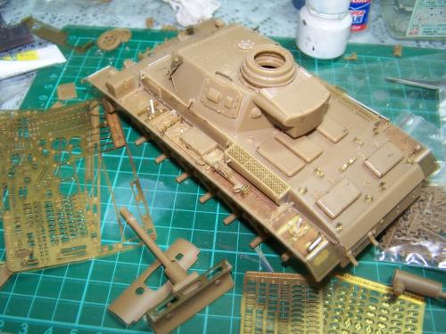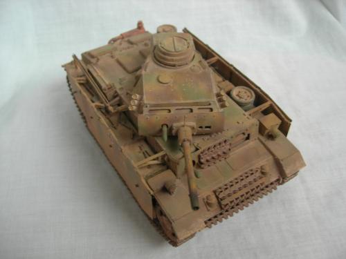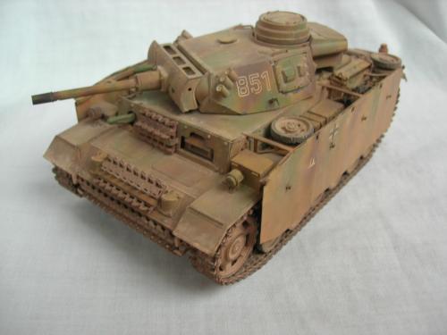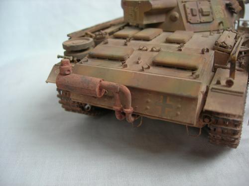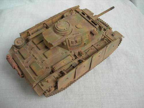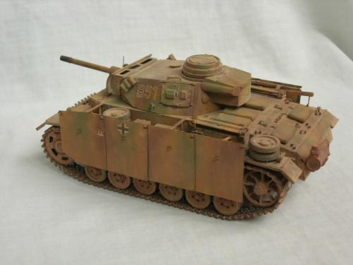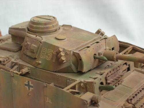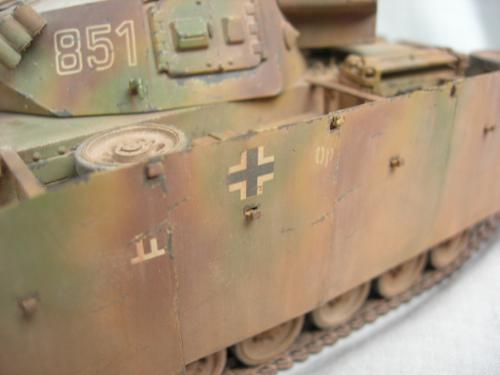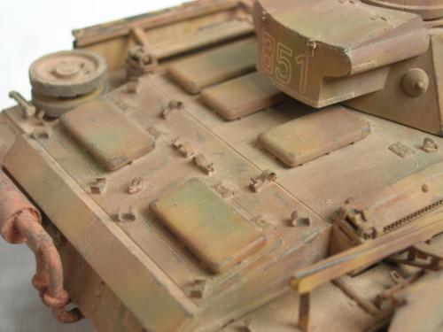 这款是郡仕包装的产品,大约是2004年左右在sonicbbs上从陈朴先生那里淘来的,然后一直烂尾至今。恰好有这么个比赛,查阅了一些资料,在1943年7月,隶属于第6、第10及“大德意志”装甲师的41辆Panzer III(Fl)参加了库尔斯克战役,于是就把灰尘扫了扫拿来参赛了。 首先要确定作哪辆车,由于参战的数量不是很多,实在是不好确定涂装和战术编号,说明书上的是意大利战场涂装,那辆F24和他的兄弟F23都是被俘虏的。找了许久在第一版的装甲战彩上找到一幅库战中的III号喷火坦克,第6装甲师的851号。照片上能看出851号喷涂有迷彩,但是看不出究竟是双色还是三色迷彩,考虑到第六装甲师隶属于南方集团军,南方少植被,战车多数是在黄色底漆上喷涂红褐色迷彩,于是打算做双色迷彩。但是接着在Osprey社的《Flammpanzer - German Flamethrowers 1941-45》和Wydawnictwo Militaria的《Flammpanzer》两本书里找到了这辆车的两幅侧视彩图,迷彩纹路虽然不太一致,但却都是是三色迷彩的,那就做三色迷彩吧^_^ 整车用了VM出品的III号M/N型PE,当初是在益智林里受a4老大怂恿买的,这款PE是VM的早期产品了,尽管蚀刻的车体前间隔装甲很抢眼,但是对细节的把握不是很好,很多应该有的细节都没有表现,如果换成现在的话多半会作出全结构能活动的挡泥板来吧,呵呵。个人觉得整套PE最有价值的就是两侧翼子板上的防滑板了,做过龙III号M/N型的同好应该都有体会吧。 VM的挡泥板铰链是平面的,很失真,用胶棒把截面削成半圆形粘上,然后用蚀刻片锯锯出凹槽。部分零件换用了狮鸣的3突零件,比如挡泥板内侧结构和钢缆固定具。车体后下部又加了牵引挂钩上的插销和锁链,用蚀刻片的边角料制作了车体前部的履带架。看了很多照片,炮管上的瞄准具位置有前有后,851那张照片上看起来似乎在炮管根部,于是切除原套件上的瞄准具,在炮管根部钻孔用铜棒重做了一个。 照片里大多数III号喷火坦克都是没有侧面附加装甲的,唯独851车身加挂了附加装甲,但是炮塔上却没有,于是另外订购了VM的III号附加装甲装上。 照片上851号的机枪上都套了套子,用补土自制了一下,做得不太好,时间来不及了,以后有空重新改一下。 套件的履带不是很好,每块两个推出孔比较烦人,组合也比较紧,处理它们花了不少时间,不过拍出来的照片里颜色看起来有点像MK,咔咔。这款履带的诱导齿没有镂空,但却是符合实际情况的。 接下来就是涂装了,由于两个侧视图迷彩纹路不一致,索性随手喷了个迷彩。把气压调低漆调稀,本打算表现照片上那种杂乱不均匀的喷涂效果,不过最终的效果还是差强人意,还要继续努力啊。接下来就是标记了,两张侧视图上的伪装师徽都是黄色的,但是装甲战彩上说是白色,看照片感觉似乎颜色很浅,而且黄色的师徽多用于德国灰底色上,黄底色上多采用白色师徽,刚好手头龙的251里的水贴有两个白色的党卫军第2帝国装甲师的伪装师徽,和这个很相似,稍作修改贴上就行了,铁十字用的也是251中的水贴,C记的水贴还是不错的。炮塔上的851编号是白色空心的,于是又翻箱倒柜一番,找出龙的I号非洲军的水贴,刚好有这个样式的编号,0-9都有,也是C记的,终于发现龙这个备用零件贩子的好处了,哈哈。至于侧面附加装甲上和驾驶员窗旁边的Op标识和星形标识就只能手绘了。喷涂轮子的时候先喷了外圈的胎黑色,然后用狮鸣的飞机刻线模板遮盖喷中央的黄色,效果不错^_^ 再接下来就是渍洗滤镜掉漆锈渍上土,前面写太多,实在有点累了,有空再补上吧^_^ 由于单位搞611工作制,每个星期只有一天休息。整个进度拖了很久,直到10月28号下午才完成,结果碰上下雨,拍照实在是没办法,颜色比较暗了。可惜今天是截止日期,没机会重新上传了。