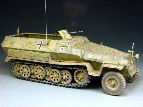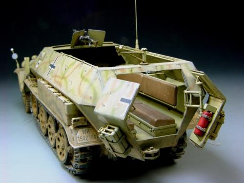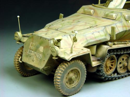 由于搬家的原因,好长段时间都在收拾家里。紧赶慢赶,今天终于完成了作业。因为是库尔斯克题材,所以选了251C。模型是号手的板子,配了沃雅的片子。因为龙那款很出色的活动履带,所以改造了活动悬挂和活动主动轮。在桌子上推作小小的251前进,履带和悬挂活动自如。可惜转向轮不能滚动,确实遗憾不小。由于赶时间(还要参加SM时代杯比赛),涂装和旧化没什么大的动作,一切都是老规矩。个人觉得负重轮旧化缺乏变化,比较单调。