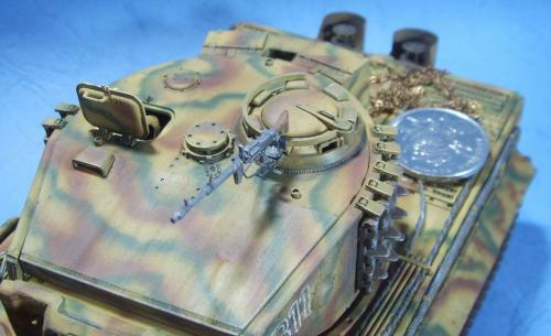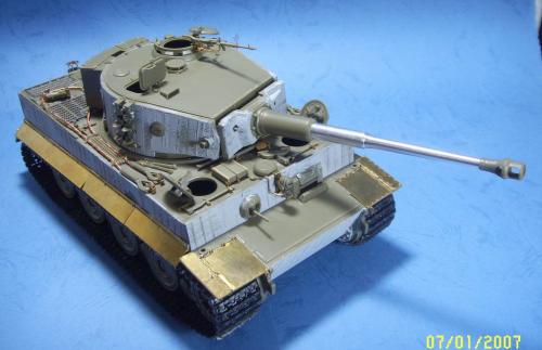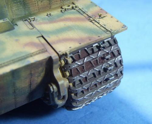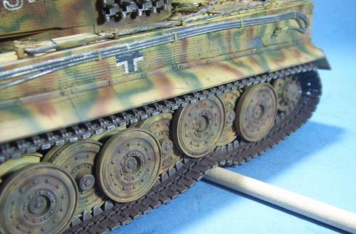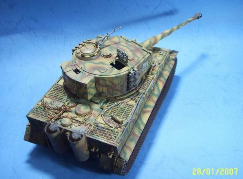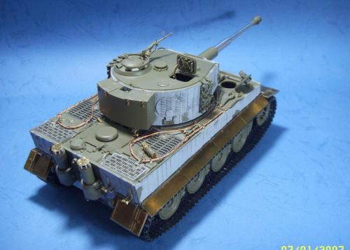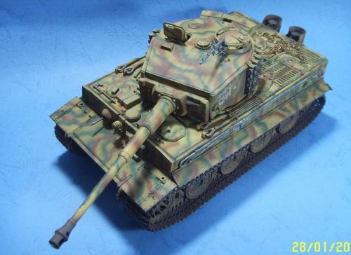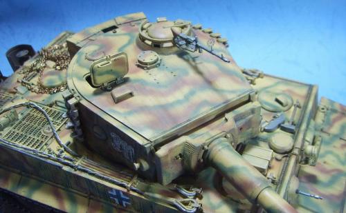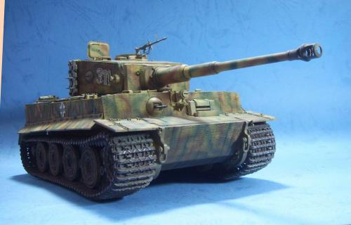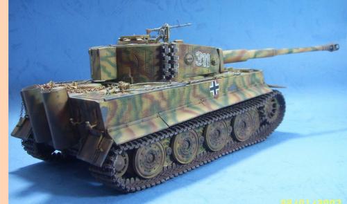 使用的是AFV的35079后期虎套件和沃雅的35056配套蚀刻片。 为了表现AFV的活动悬挂,用田宫的后期虎中的拼接履带替换掉原套件中的橡胶履带,并手钻自虐一周,完成活动履带的制作。 防磁装甲采用田宫灰色牙膏补土和田宫防磁刮片完成。 前后挡泥板的蚀刻改造件细节相当丰富,几乎是一大亮点。 套件中给出的钢缆纹理几乎丧失,不得已,只好用耳机线改造出来。 最大的难点就是前后挡泥板中的折页的制作,着实费了一番功夫。 素组完成后,整车喷一遍金属底漆,1000号水补土一遍,然后就是迷彩部分,由于购买的0.2MM喷笔还没到货,只好用0.3MM的喷笔来喷条文。气压调到最低,出漆量也调到最低,这时的条文还是比较纤细的。 条文迷彩的绘制比较随意,大多考虑的还是美观。 考证部分: 从网上获得的资料显示,311号战车是503重坦克营第3连第1排指挥官中尉Von Rosen的座车。 诺曼底战役(1944年6月11日)Gibreville的一次遭遇战中,Von Rosen带领他的排击毁了英军的12辆坦克和4门反坦克炮,并且还俘获了2辆英军的Sherman式坦克。