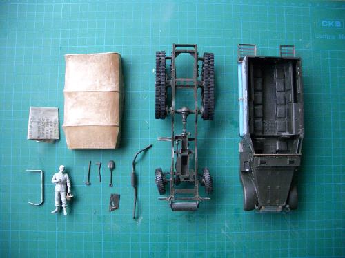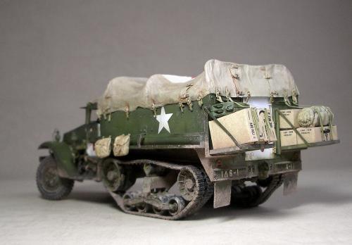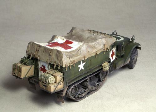 M3系列半履带车辆被广泛的运用于二战的各大战场,她独有的混血血统使之能更好的适应各种路面环境。并被广泛运用于兵源输送,物质运输及医疗救护等多个方面。记得儿时看见橱窗中的这盒田宫m3a2模型时就被其漂亮的封绘所吸引,但对于还在玩5元一盒环球的我来说100的价格绝对是天文数字.。直到去年才把她收入帐下,也算圆了儿时的一个梦想,板件拿到手一看大失所望,30岁的板件,很多一体化的零件,按比例每块都和坦克有的一拼的装甲板厚度,使他看上去更偏向于玩具。不过鉴于田宫模型的锐度和良好的组合度还是值得一改的。 去年年底,听说号手将新出m3系列车辆,为了不让它成为文物决定马上下手,半敞开车辆的内构是很让人头痛的部分,也因装甲板厚度无法打磨的原因决定做个车棚将其盖住,以便偷懒,后来证明我错了,自制车棚比起内构来说要折磨人的多:(。而做成军用救护车辆的决定确是因为喜欢那绿色车体上提神的大红十字,好“色”是我一惯的追求。 制作过程还算顺利,对照参考实车图片改造就能很好的完成,最头疼的事就是打磨每一块比例超厚的装甲板,而车头那和散热片开为一体的零件让人着实苦笑不得,只好切开自制,细节上追加了一些PE,而那些被打磨掉的螺钉也用香烙的办法一一追加,车棚的制作可是让我绞尽脑汁啊,用传统的纸巾无法表达这种怪异的车棚造型且缺乏紧绷感,于是自创用木版做了个车顶模块并加上棚杆,再用家用的保鲜膜紧绷其上,然后将无纹路的草纸用乳胶裱于其上,多裱几层等其干后就可以脱模了,这种方法可以制作出紧绷的车棚造型,但却因为保鲜膜的柔韧性使得反映到纸上后一些细节丢失,希望下次能找到更合适的材料和办法。而每个棚扣都用软包装牛奶盒纸和铜丝制成,这是个耗耐心的工作,不过完成效果的回报还是很值得的。后履带行走部分橡胶履带实在恶心,索性就把它粘死固定造型还好点。而其他上色旧化的过程也就那几板斧,在此就不复述了。
