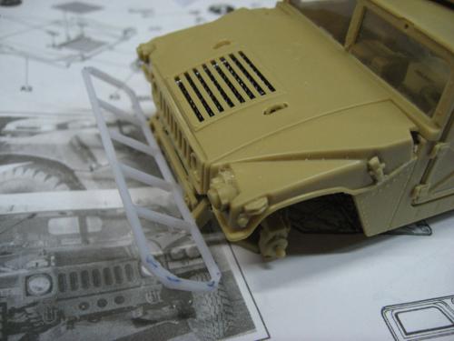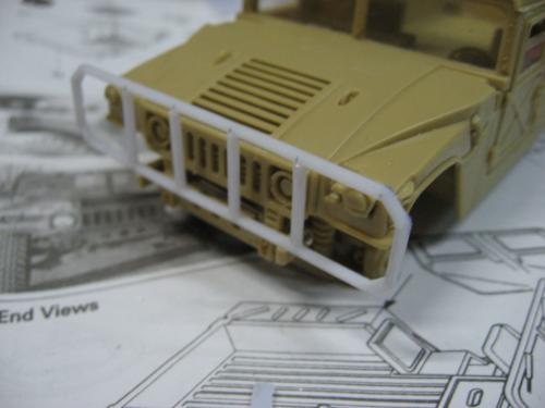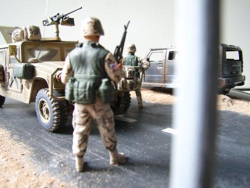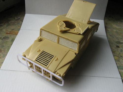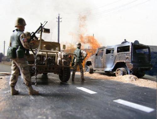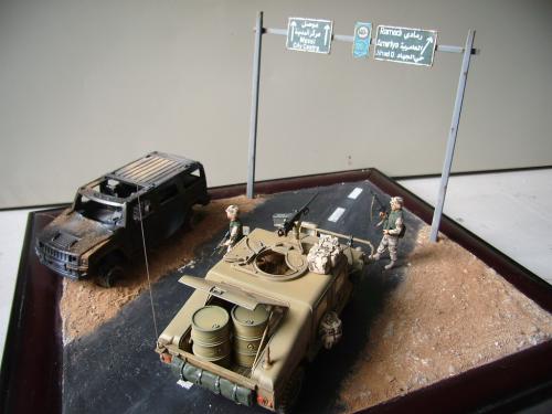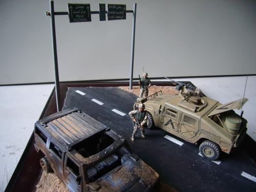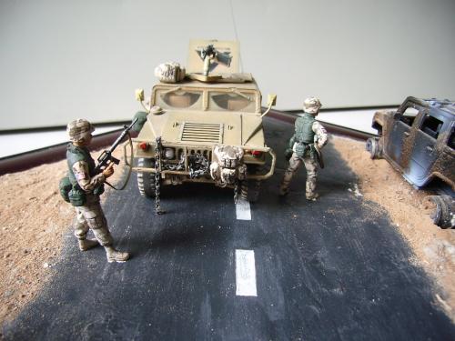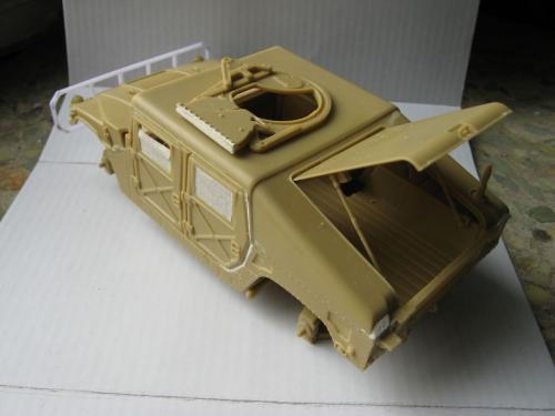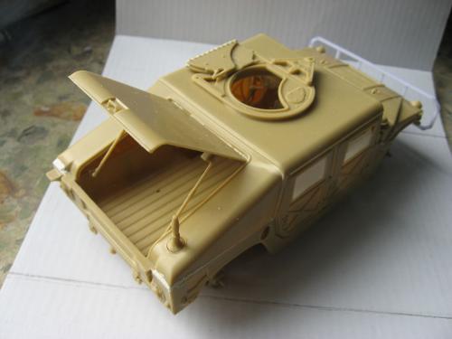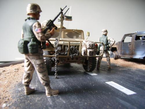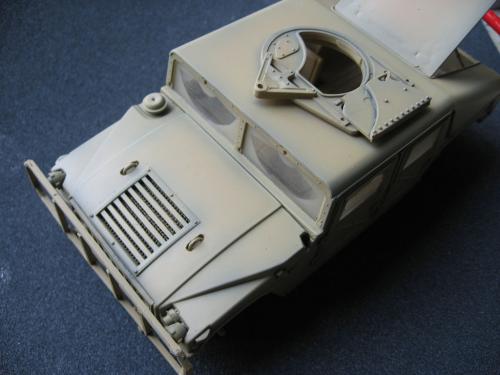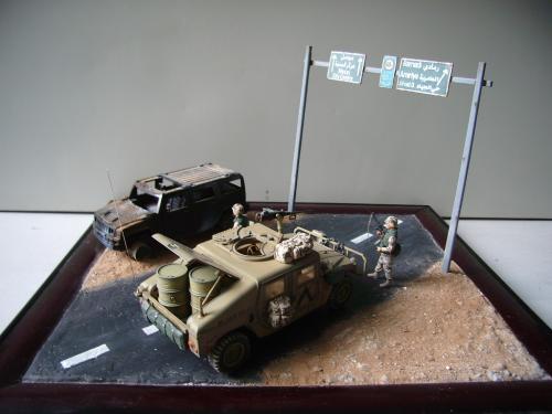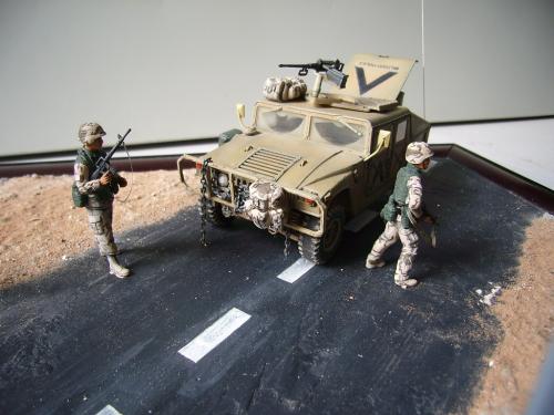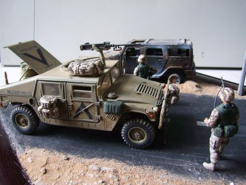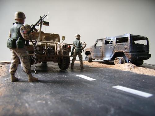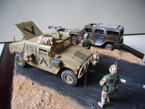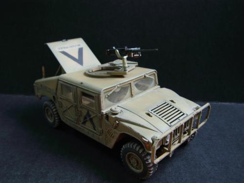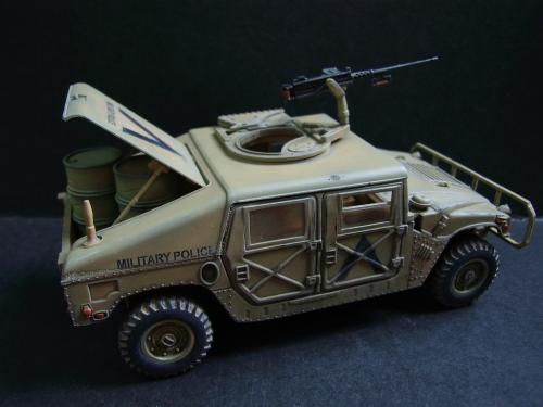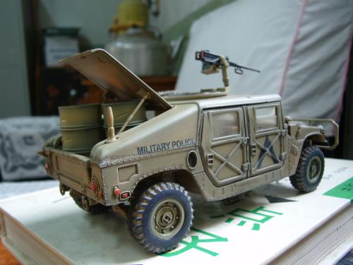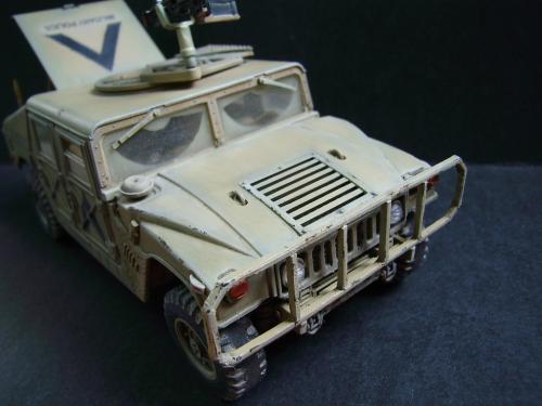 在世界武器发展史上,似乎很少有一种军用车会像“悍马”这样。受到如此多的争议。在他诞生若干年里一直岌岌无名,一场海湾战争使他一鸣惊人。成为全世界追捧和效仿的对象;然而两年后。在摩加迪沙的街头他成了被人痛扁的孬种;更加糟糕的是,十二年后当他再回到伊拉克的时候。他成了备受指责的垃圾虫。批评他的人说,从外观’上他几乎毫无美感丑陋至极像一条被晒干了的癞蛤蟆;欣赏他的人说,他外形彪悍线条阳刚拥有男人般的铮铮铁骨。目前国内关于“悍马”的文章已经有很多,但是大多数只停留在技术规范的浅尝辄止。美军在伊拉克和阿富汗的作战侦察中,使用的主要是M1025型和M1114,M1025最突出的问题是装甲不足。 制作:板件是西西里的,要多烂有多烂。飞边多的要死,零件严重变形和缩水。经过艰苦的素组以后,才能领略到悍马的威风。因为时间仓促驾驶室没有上色,改造方面也只是加了一个前保险杠。上色用模王漆采用了常见伊战涂装,先喷底漆,然后喷色差,最后上主色。旧化还是常用手法:油画颜料熟褐加黑整车渍洗,干后用土黄、白、黑调出浅土色进行干扫,最后粉彩修饰。这次没有做很重旧化效果。