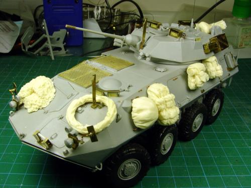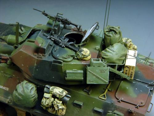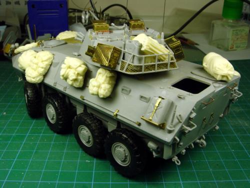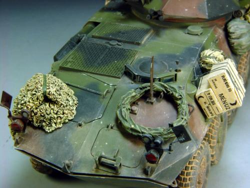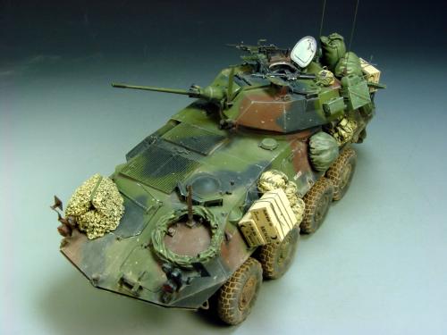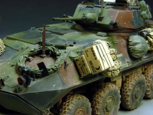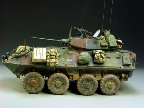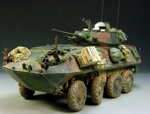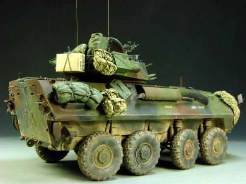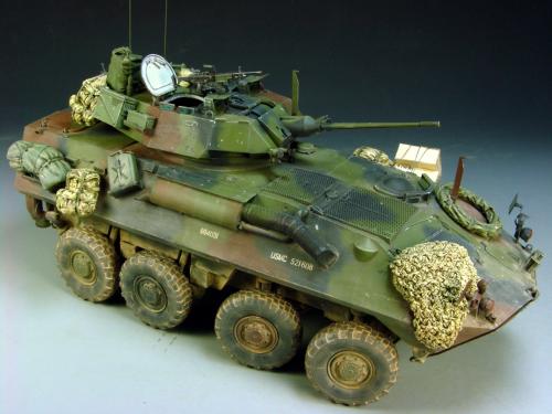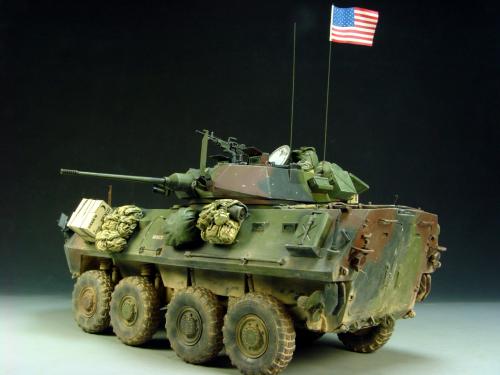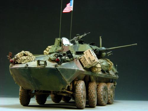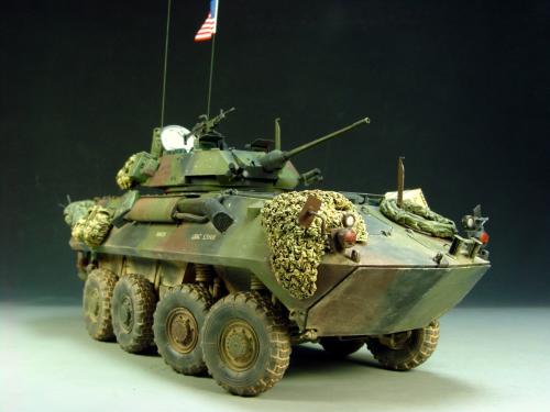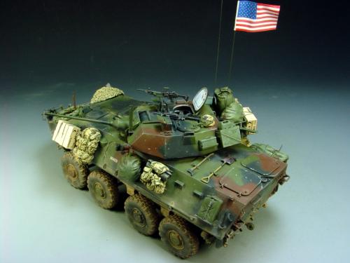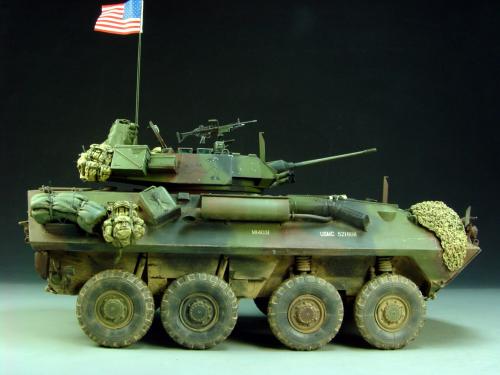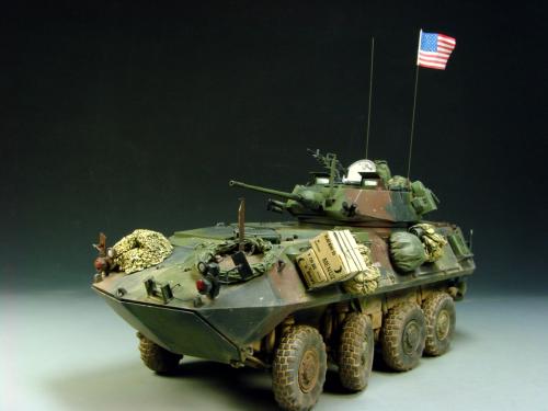 在第一次海湾战争中,100小时地面战争之初,美国海军陆战队第二师担任牵制伊军作战的东路主力,交战2个小时就突破了伊军3道防线,为联军“声东击西”战术的成功立下了汗马功劳。其中,海军陆战队轻型装甲步兵营的轻型装甲车LAV25,配合M1坦克勇猛突击,战功卓著。这次进攻被认为是“第二次世界大战以来,海军陆战队发动的最大的一次进攻”。 套件是小号手的产品,配用了“沃雅”蚀刻片和草帽的车挂装备。号手的这款模型简洁但缺乏细节,精细的“沃雅”蚀刻片正好弥补了模型的不足,而且精致的金属箱子漂亮得不忍上色了,富裕的大片捆扎带也为今后的模型改造提供了便利。 除了加装蚀刻片,我在全车底盘的棱角处用笔刀背勒出了焊痕,全部把手和挂钩用铜丝换掉,车长舱外加了套件自带的“米尼米”机枪。涂装选用了海军陆站队原用的北约三色迷彩。渍洗、滤镜、干扫什么的都没什么,但天然土调色却出了点问题,偏土黄了点。靠,模型做老了还出现这种状况。遗憾啊遗憾。那面美国旗花了不少功夫,红色、蓝色、白色用遮盖法一一喷好,再用笔点出上面的几十颗星星(其实就是小白点)。因为后天要到北京出差,所以今晚把所有装备赶完装上,再放了只M4和头盔,一切就算OK了。不足之处请大家斧正。