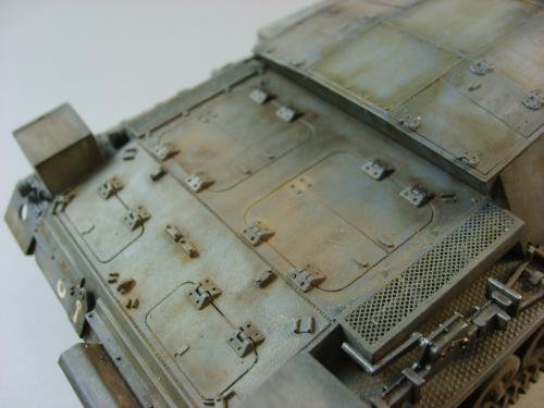 套材为威龙9031,全车基本直做,用银箔改造了两块前挡泥板,并制作出碰撞后的弯折感,上色后感觉不错 :)。全车制作重点在于底盘泥土和车体污渍的表现。底盘泥土前后共5次上色,由深至浅,比较有层次感。污渍的表现使用了洗、滤镜和干扫等多种技法,表现了多种污渍效果,并使得模型的色彩层次更丰富。