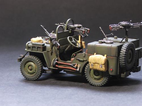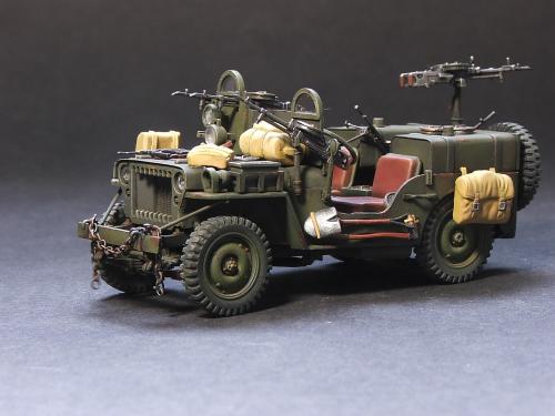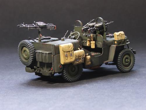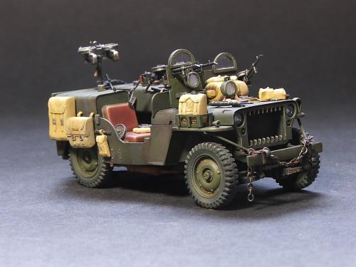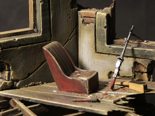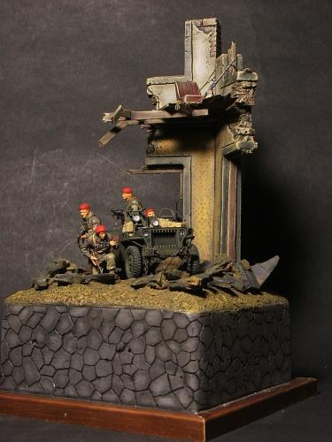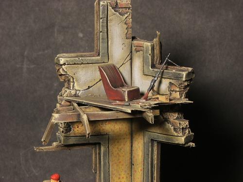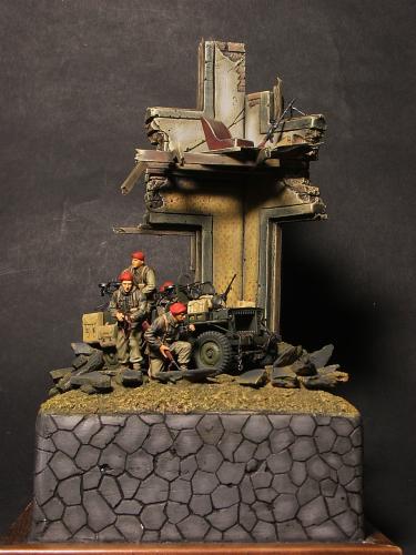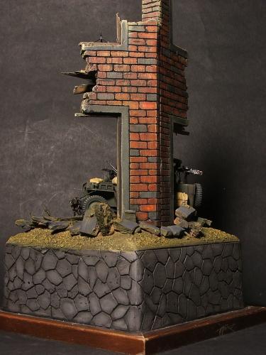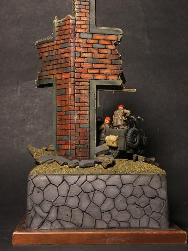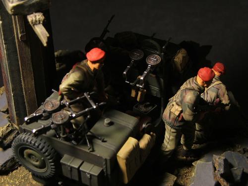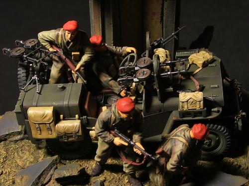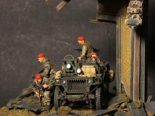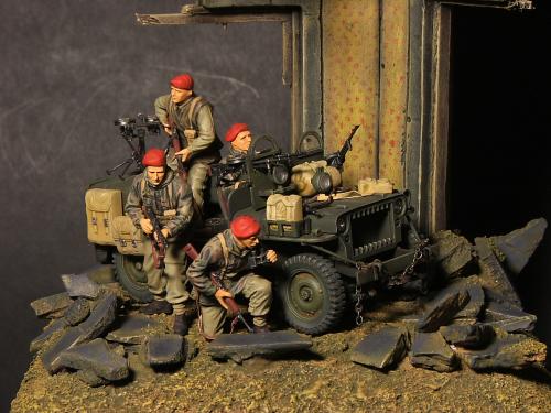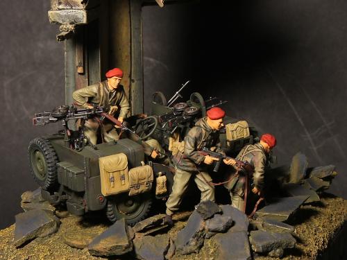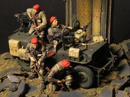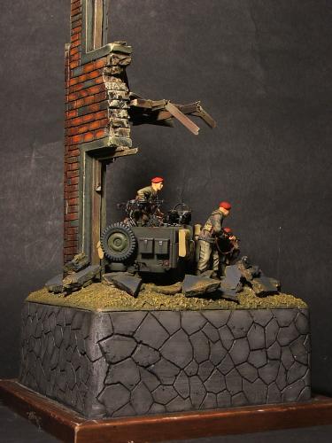 使用了意大利的SAS突击车,龙的SAS队员。稍微车辆的悬挂做了点修改以增加重量感。车上堆积了点杂物和枪支(大多是套材自带的)这个作品在构图上多借鉴了日本高手崛川哲生的作品。墙壁和地面都是小弟用石膏自制并无难度。2楼的楼板由木条自制。弹壳是铜丝剪的。SAS队员的红色蓓蕾帽是此情景的亮点。情景的内容是:1945年3月25日-5月3日 第1特别空勤团和第2特别空勤团在德国本土的莱茵河东部至基尔一线,开始使用重武器装备的吉普车作战。 一个SAS小队深入敌后进行侦察任务。谢谢观赏(请点开看大图)