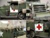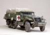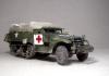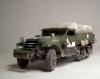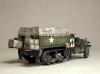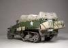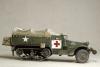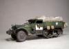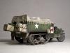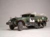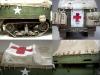 M3系列半履带车辆被广泛的运用于二战的各大战场,她独有的混血血统使之能更好的适应各种路面环境。并被广泛运用于兵源输送,物质运输及医疗救护等多个方面。记得儿时看见橱窗中的这盒田宫m3a2模型时就被其漂亮的封绘所吸引,但对于还在玩5元一盒环球的我来说100的价格绝对是天文数字.。直到去年才把她收入帐下,也算圆了儿时的一个梦想,板件拿到手一看大失所望,30岁的板件,很多一体化的零件,按比例每块都和坦克有的一拼的装甲板厚度,使他看上去更偏向于玩具。不过鉴于田宫模型的锐度和良好的组合度还是值得一改的。 去年年底,听说号手将新出m3系列车辆,为了不让它成为文物决定马上下手,半敞开车辆的内构是很让人头痛的部分,也因装甲板厚度无法打磨的原因决定做个车棚将其盖住,以便偷懒,后来证明我错了,自制车棚比起内构来说要折磨人的多:(。而做成军用救护车辆的决定确是因为喜欢那绿色车体上提神的大红十字,好“色”是我一惯的追求。 制作过程还算顺利,对照参考实车图片改造就能很好的完成,最头疼的事就是打磨每一块比例超厚的装甲板,而车头那和散热片开为一体的零件让人着实苦笑不得,只好切开自制,细节上追加了一些PE,而那些被打磨掉的螺钉也用香烙的办法一一追加,车棚的制作可是让我绞尽脑汁啊,用传统的纸巾无法表达这种怪异的车棚造型且缺乏紧绷感,于是自创用木版做了个车顶模块并加上棚杆,再用家用的保鲜膜紧绷其上,然后将无纹路的草纸用乳胶裱于其上,多裱几层等其干后就可以脱模了,这种方法可以制作出紧绷的车棚造型,但却因为保鲜膜的柔韧性使得反映到纸上后一些细节丢失,希望下次能找到更合适的材料和办法。而每个棚扣都用软包装牛奶盒纸和铜丝制成,这是个耗耐心的工作,不过完成效果的回报还是很值得的。后履带行走部分橡胶履带实在恶心,索性就把它粘死固定造型还好点。而其他上色旧化的过程也就那几板斧,在此就不复述了。