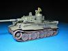 非洲军虎I与初期型虎I的相似最大。CYBER-HOBBY的非洲军虎I说明书已经将细节说明得很详细。所以要威龙的虎改起来并不太麻烦,因为说明书很多都是相似的。非洲军虎I和初期型最大的区别在于排气管的护罩和炮塔的后部储物箱。护罩在沃雅和ABER的蚀刻片里已经有提供,后部储物箱本来打算使用沃雅提供的专门非洲型蚀刻片,但是在询问了沃雅销售人员以后,得知还没有上市。所以只好选择自己制作,关于制作的具体步骤,可以参考我之前发的树脂翻模的帖子。这个储物箱比晚期型的储物箱要扁一些,是最明显的特点。 材料装备好之后就是制作的问题。制作上没有什么值得特别指出的。涂装方面,选择了比较特别的绿色涂装。实际上严格来说,从CYBER-HOBBY的说明上都可以看出实际颜色是一种类似潜灰色的颜色。在阳光的长时间照射下,会显得有些发绿。但是为了美观决定还是加一些绿色成分里面。我这次使用的颜料是MODEL MASTER的水性涂料。使用后效果非常好,可以说是我用过的最好的涂料了,当然价格也很贵,一瓶颜料的价格相当于2个田宫水性的价格。 旧化方面,使用的是我一贯使用的方法——天然土。没用油画颜料泽洗,因为是单色的缘故。掉漆在边缘处处理,然后是弹孔,履带方面要仔细处理。模型的旧化因人的喜好而定,我个人是喜欢唯美的风格,就是干净些。 制作完之后,感觉挺累,但是对于模型制作的经验上是得到了不少收获。如果想改龙的非洲军虎I,可以用威龙的初期虎和晚期虎一起,会省很多事。